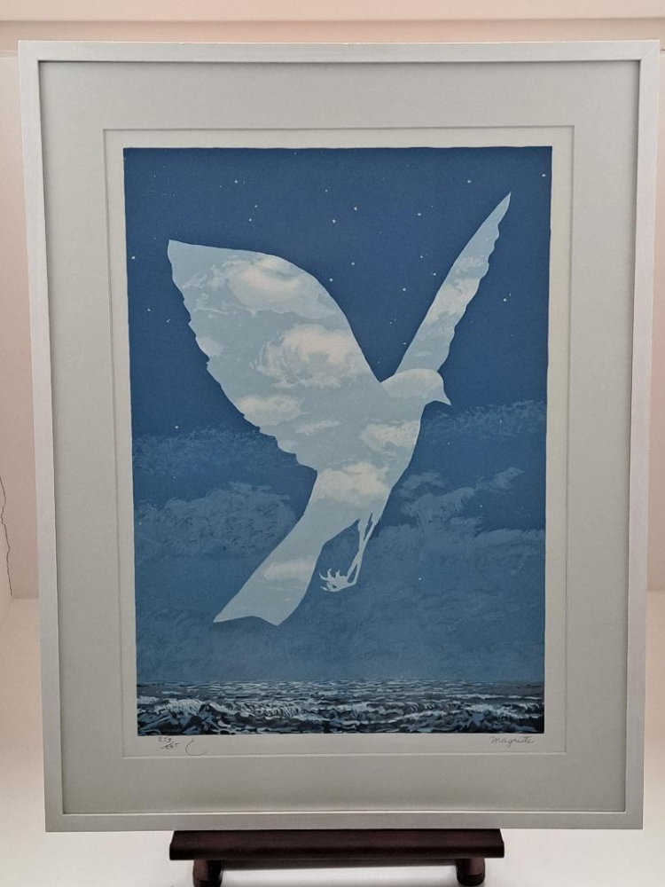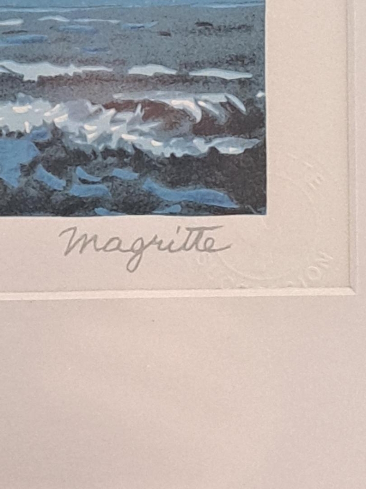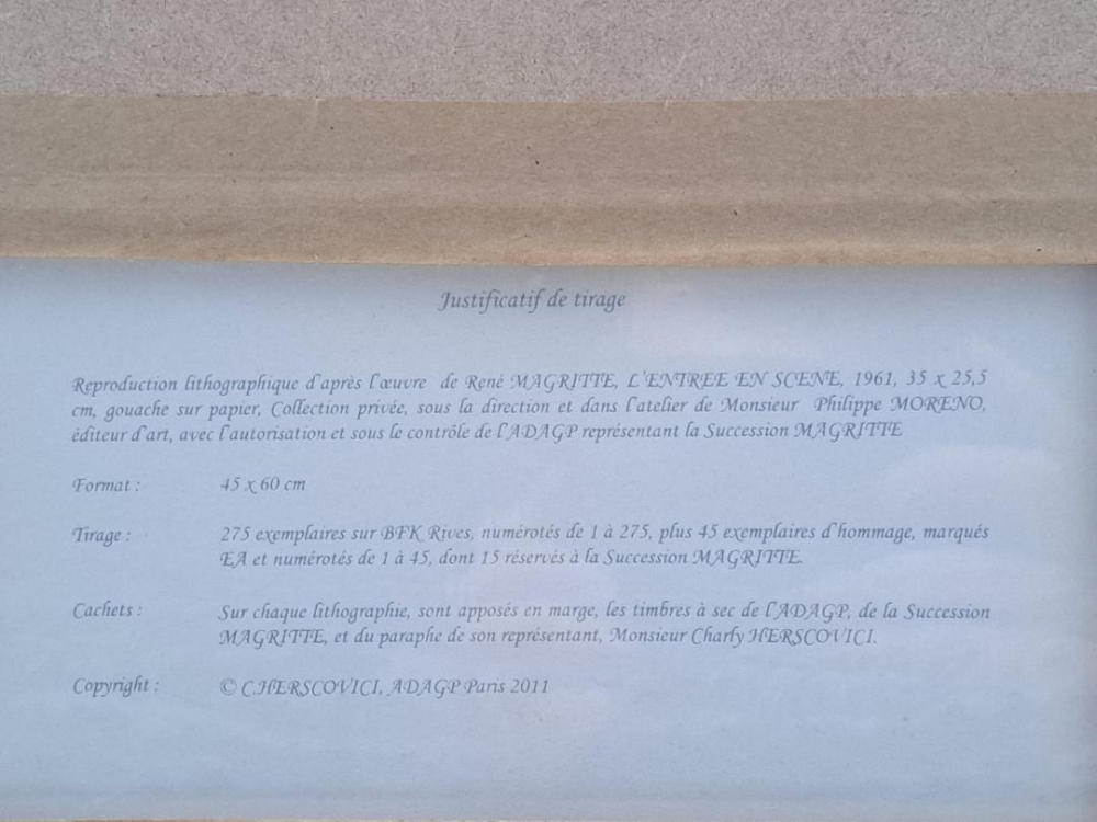 Kleurenlithografie naar het gelijknamige werk van René MAGRITTE. Getekend met naamstempel en handtekening van Charly Herscovici Genummerd op 275 exemplaren en met blindstempel "Succesion Magritte" en blindstempel "ADAGP Paris 2011" Afmetingen blad (hxb) : 60 x 45 cm Afmetingen kader : 70 x 54 cm Uitgegeven in Parijs in 2011 met goedkeuring en onder controle van het ADAGP Parijs die de nalatenschap Magritte beheert en met de handtekening van zijn vertegenwoordiger Charly Herscovici Bewijs van uitgave is geprint op de achterzijde van de litho en zichtbaar in de nieuwe professionele inlijsting. Met certificaat van echtheid van Hus Gallery, Parijs