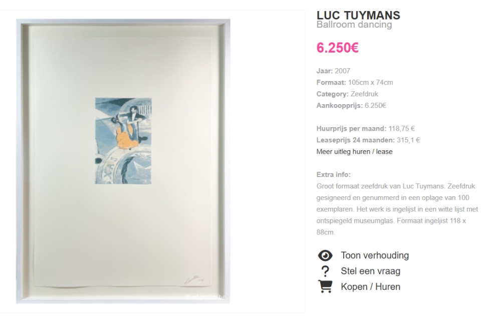 Luc Tuymans - Ballroom Dancing Gesigneerd en genummerd Editie op 100 exemplaren 105 x 74 cm (groot exemplaar) Zeefdruk op Somerset Velvet 300 g/m2 papier Uitgegeven door Stedelijk Museum, Amsterdam Gedrukt door Roger Vandaele, Antwerpen Met certificaat