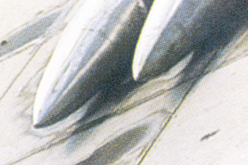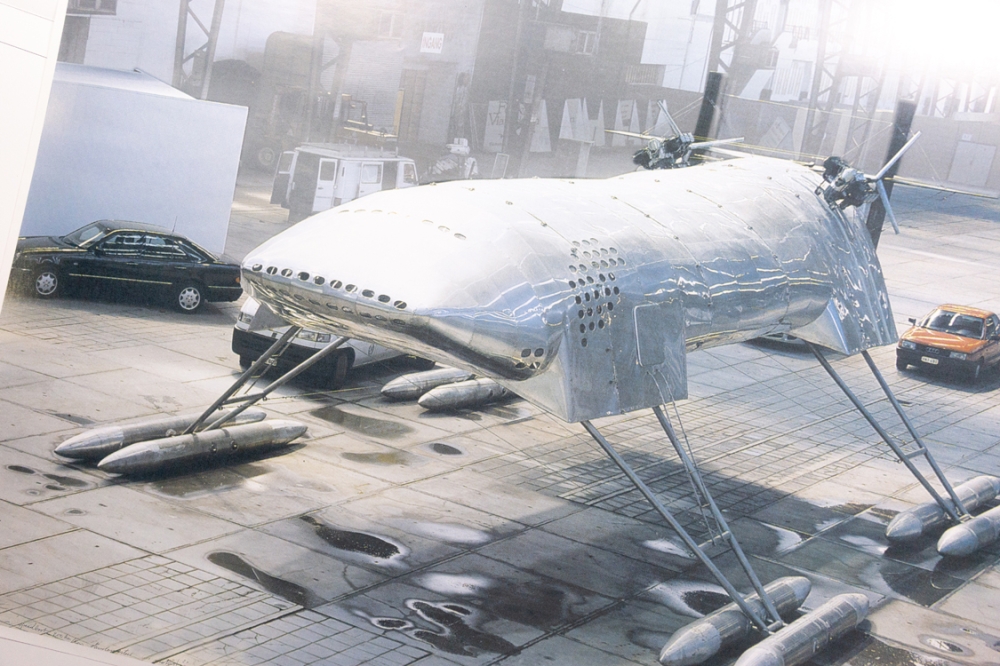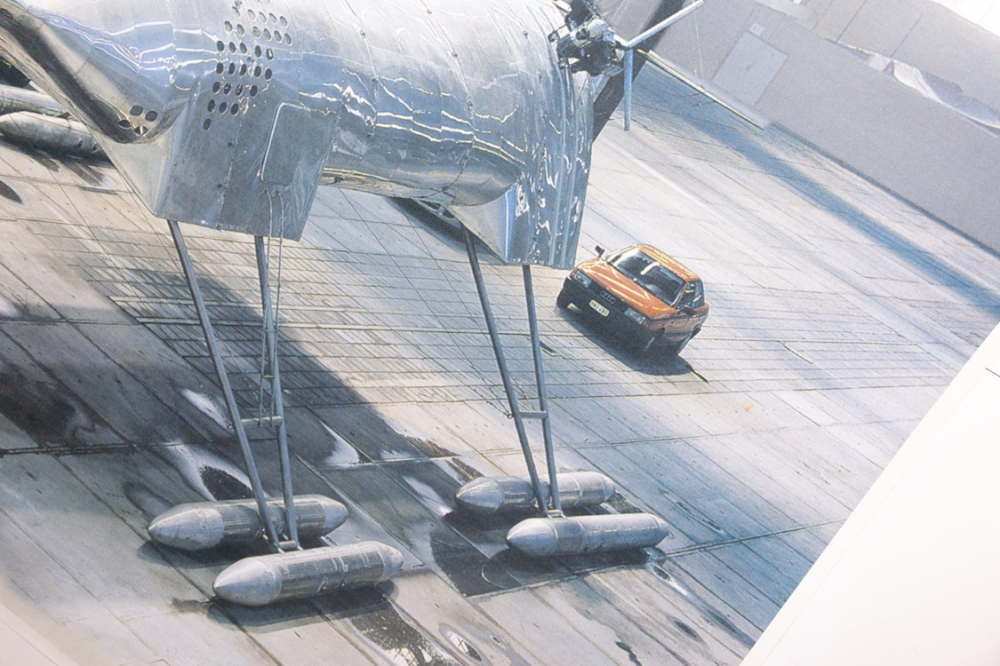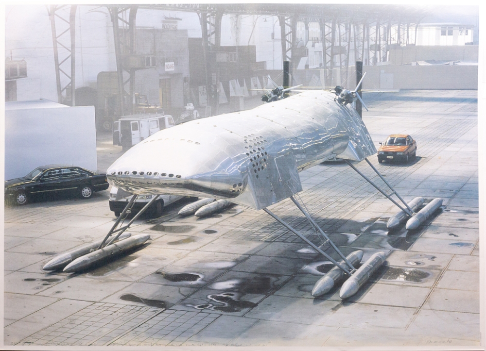 Poster / poster of Panamarenko's Scotch Gambit, one of Panamarenko's legendary objects, which ties in with the zeppelin Aeromodeller. The flying boat was only finally finished in 1999, although the first drawings date from 1966. The final aircraft is sixteen meters long, six meters high and nine meters wide.