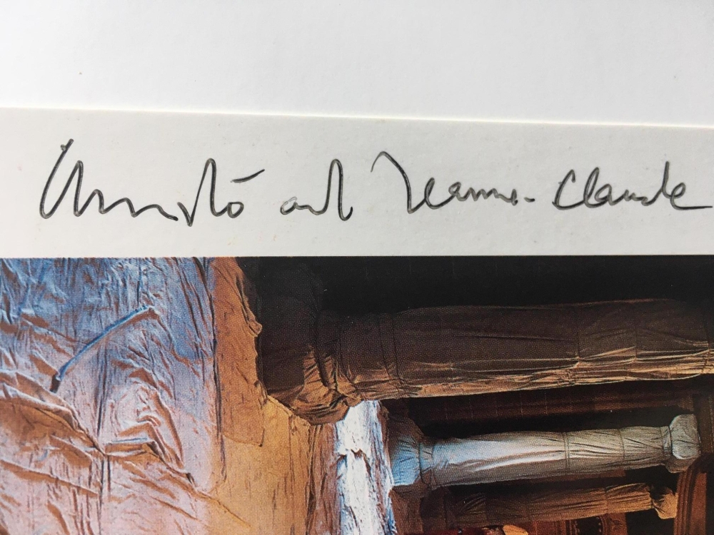 This wrapping artist decorated beautiful and unique buildings all over the world. This art card immediately shows a very nice impression of the wrapped vestibules in Sydney Size of the artcard is 10x15 cm. This is signed by Christo & Jeanne claude