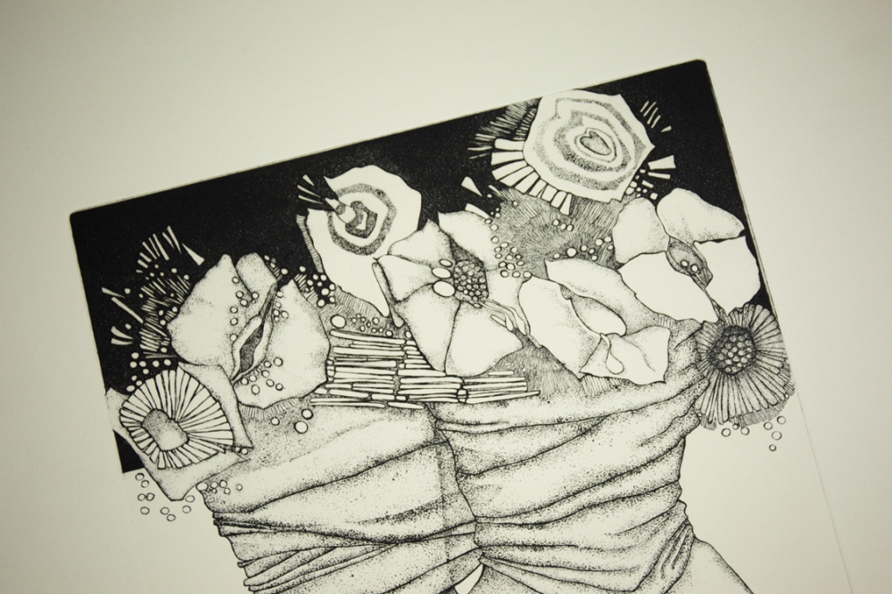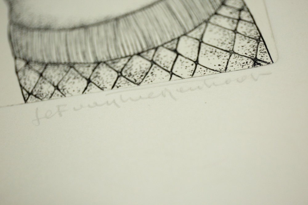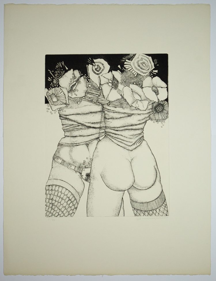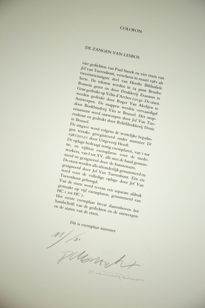 Etching by Jef van Tuerenhout (1926-2006) from the series "De zangen van lesbos". Is accompanied by a poem by Paul pike on the same paper, Vélin d'Arches 250 gr and was printed by Roger Van Akkelijen in Antwerp.