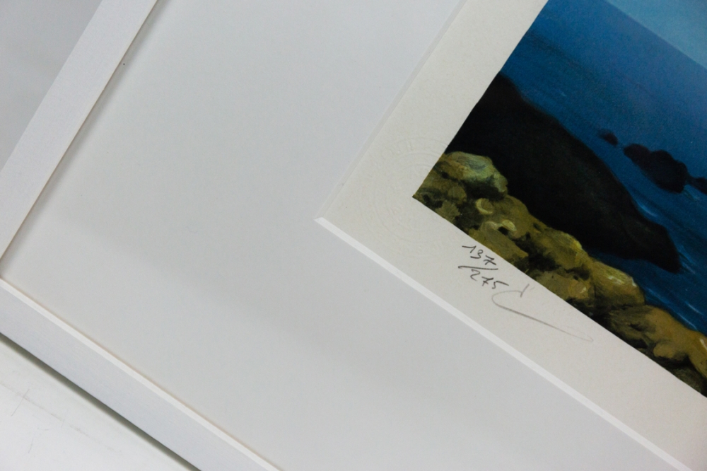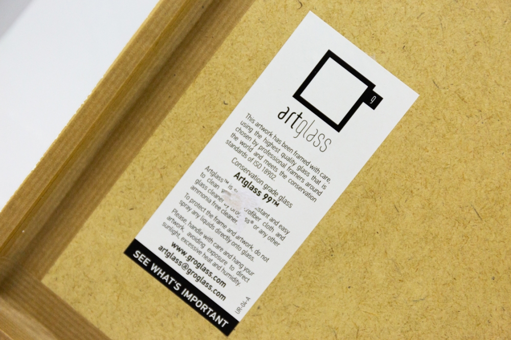 Framed in a white frame with Artglass 99, a glass that offers up to 99% UV protection.