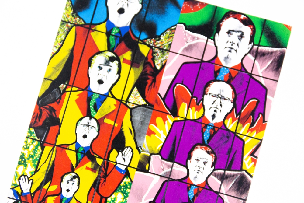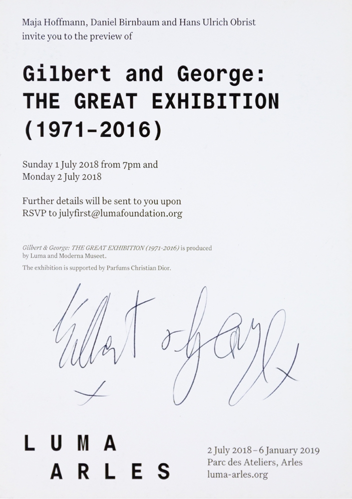 Invitation to an exhibition of Gilbert & George in Arles, hand-signed by the artist ( s) on the back.