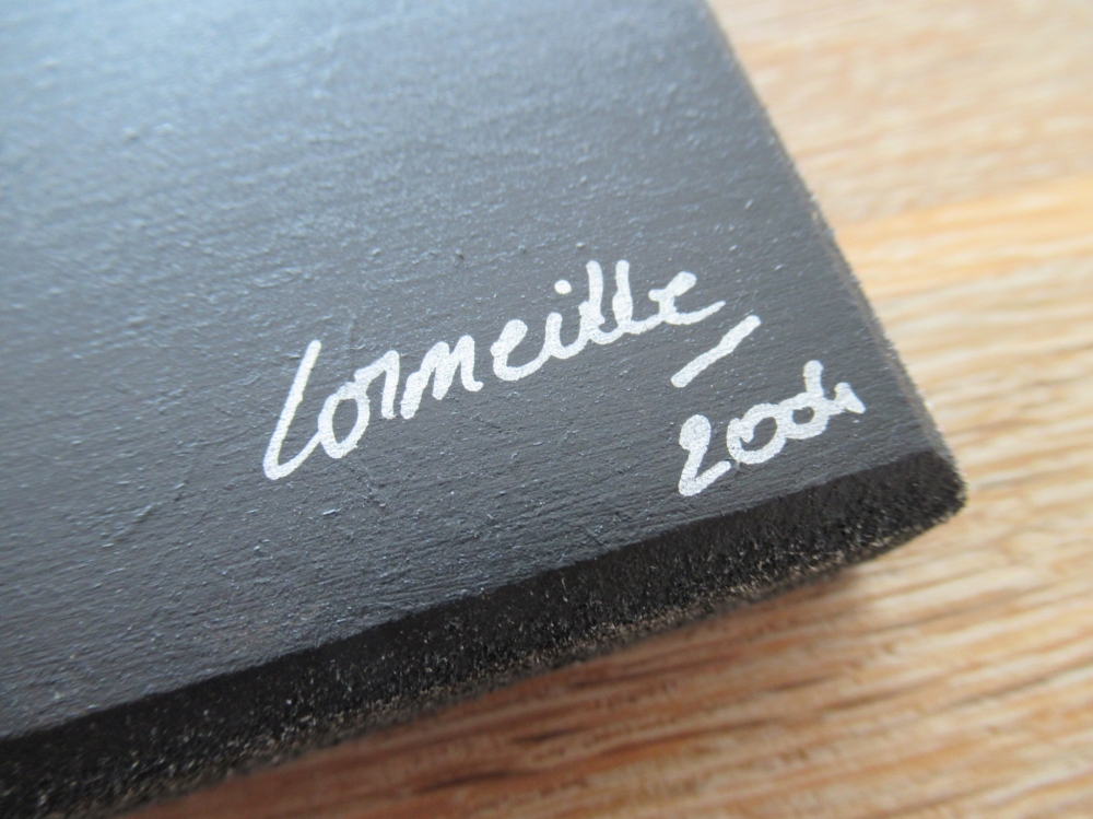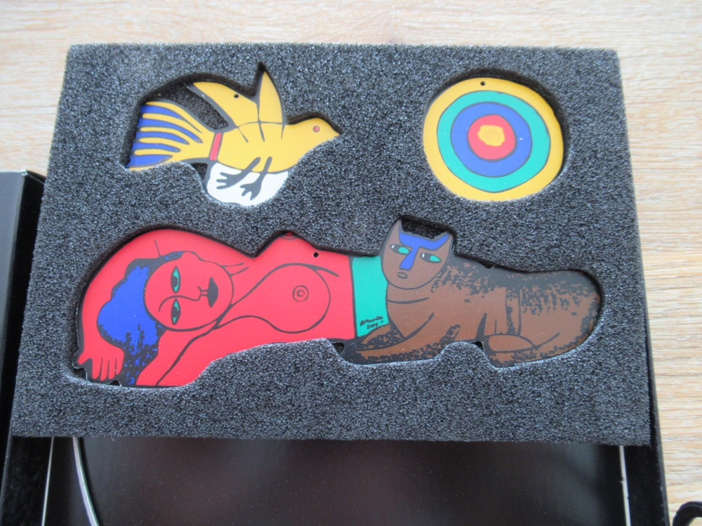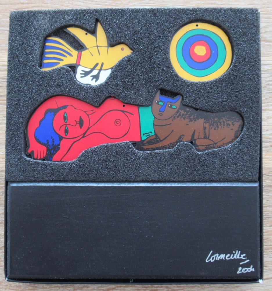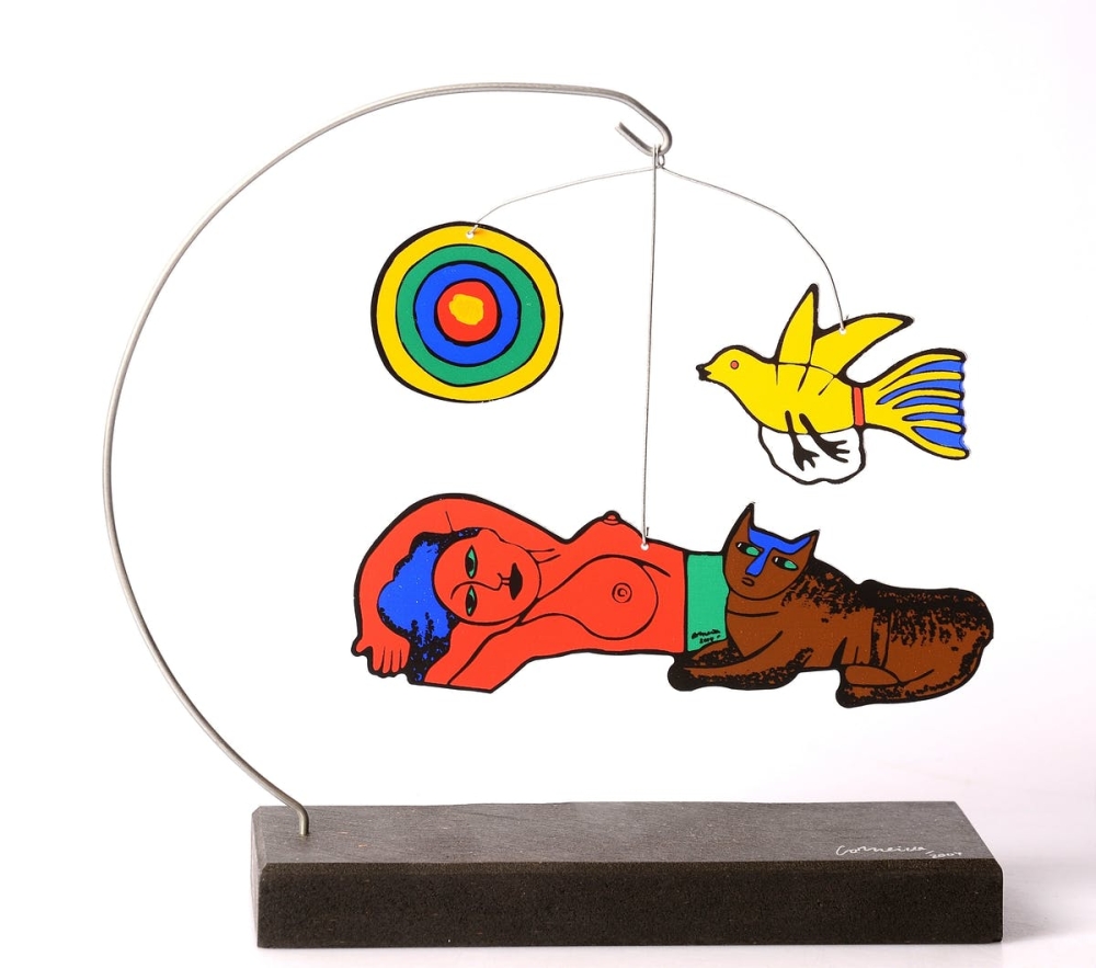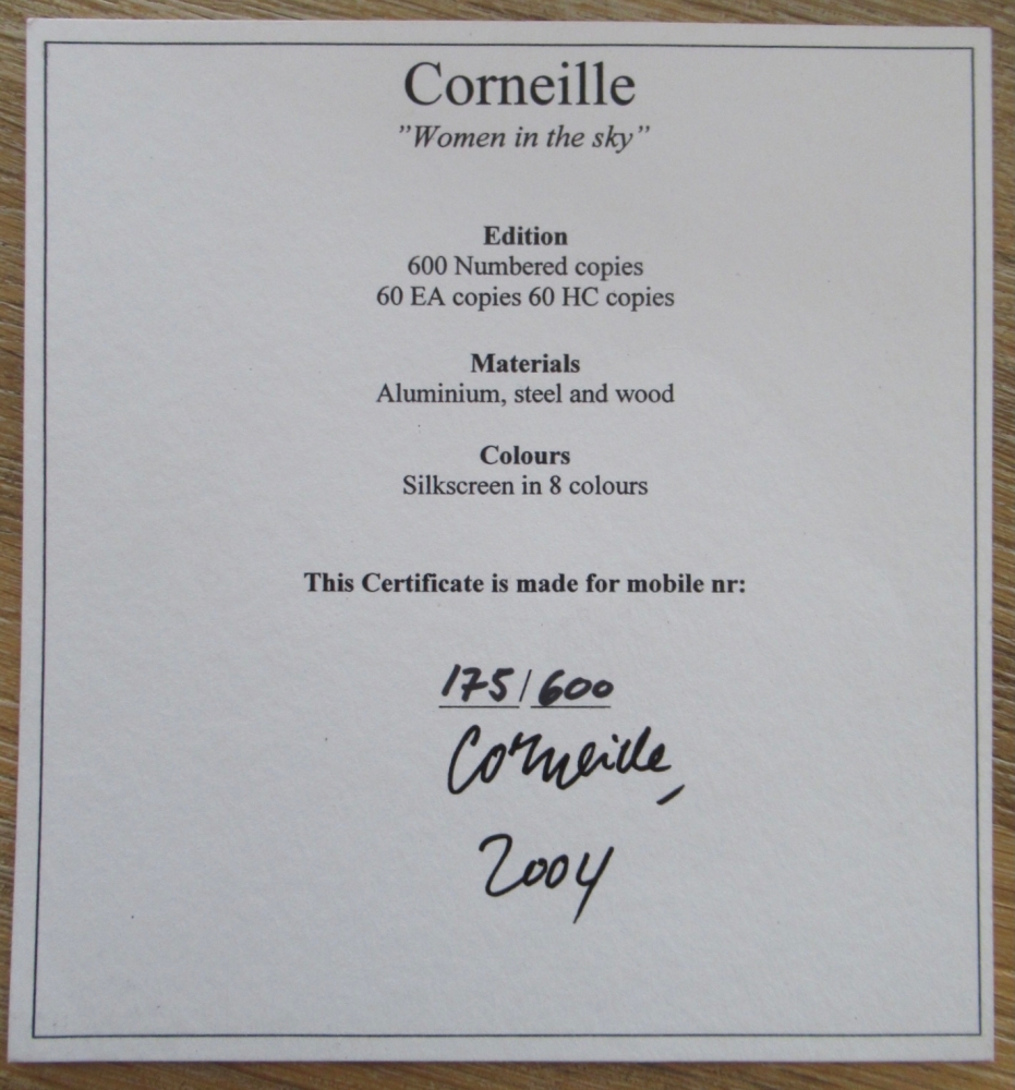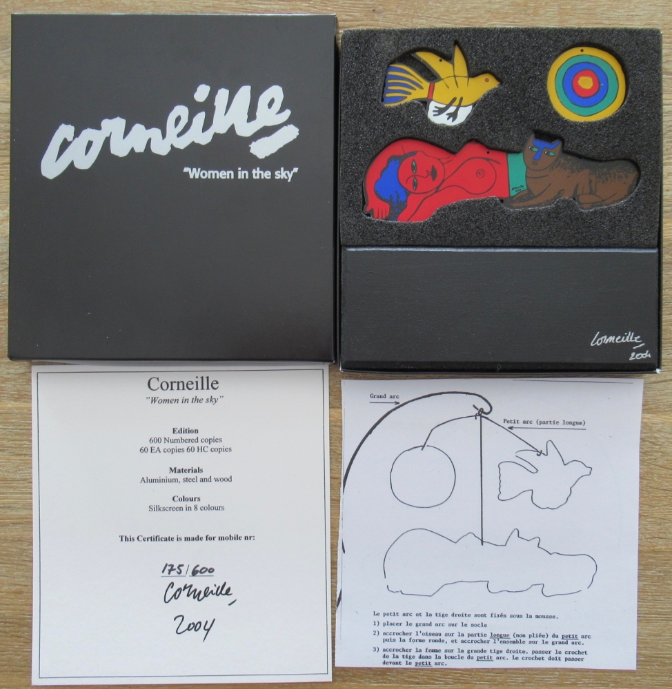 Nice mobile by Corneille from 2004. Consists of a wooden base with metal arch and colorful metal images (silkscreen on metal). This is hand signed and numbered.