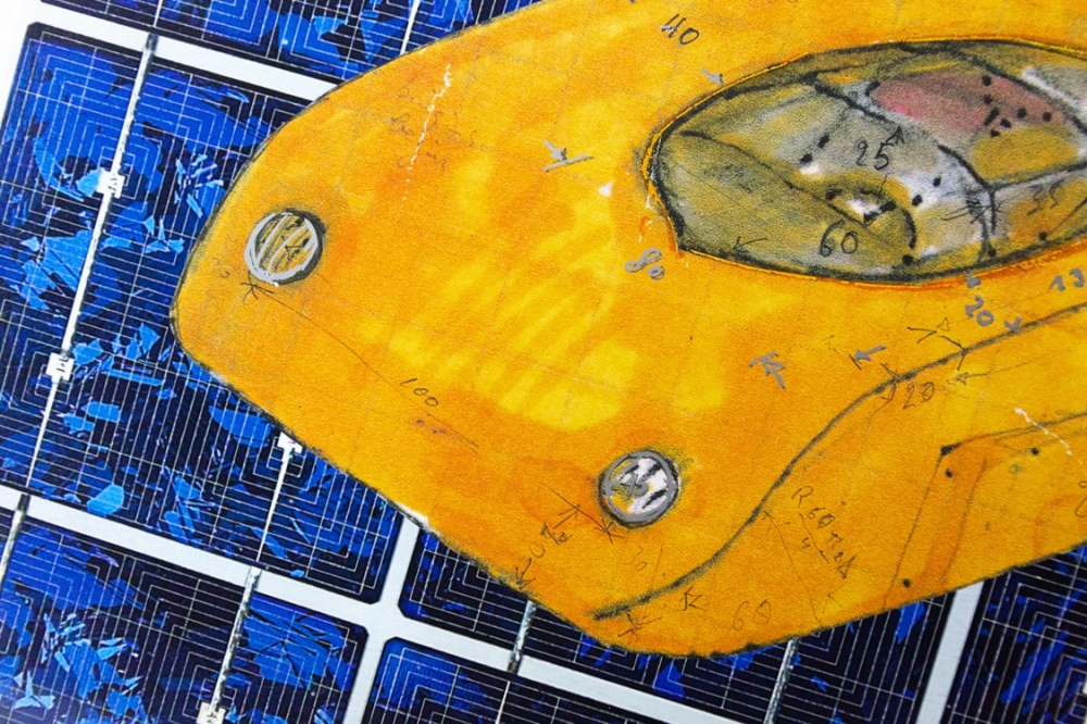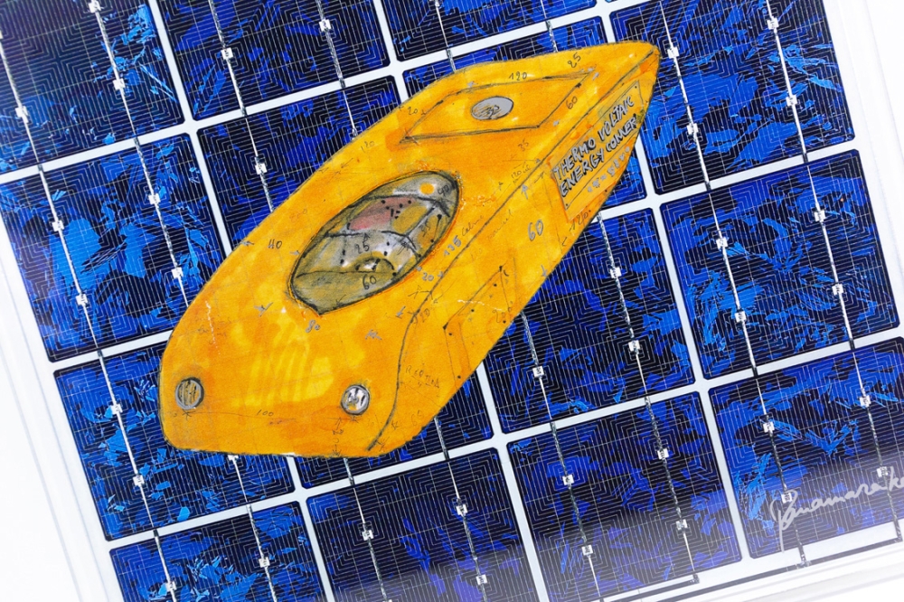 An attractive and iconic Thermo Photovoltaic folder/folder, with printed signature, professionally framed in a Plexiglas box. This folder is the original, rare collector's brochure for Panamarenko's 2001 edition, which contained six offset prints ("Energy Converter", "Solar Car", "Heat Problem", "Thermo Voltaic Energy Converter", "Burner Jaw with Sigleur" and "Sigleur" ).