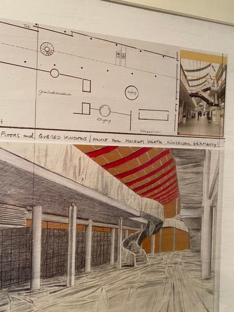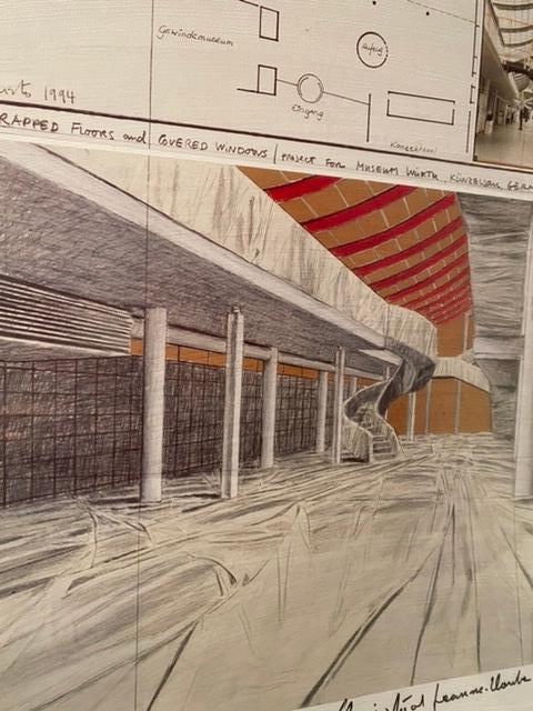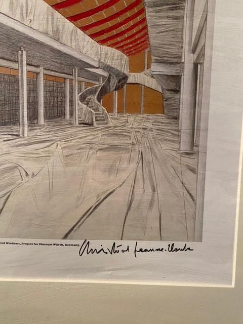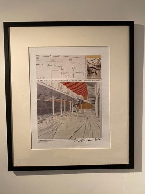 Zeer mooie offset op glanzend papier. Het werk is met de hand gesigneerd door Christo en Jeanne-Claude. Het werk heeft als titel Covered floors and stairways and windows dit was een project voor het museum Würth in Duitsland. Het werk is ingelijst.