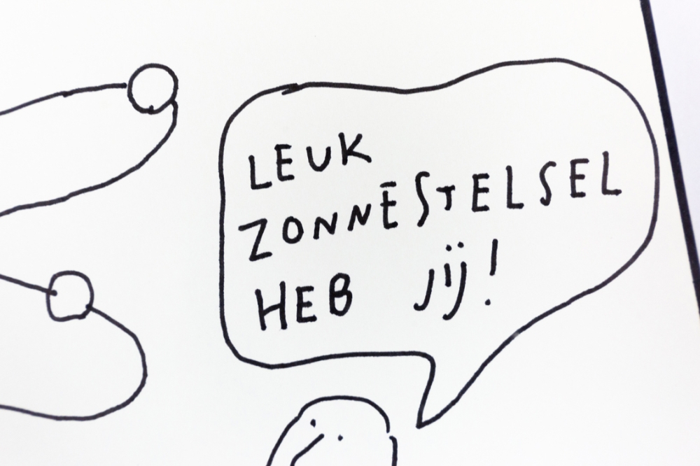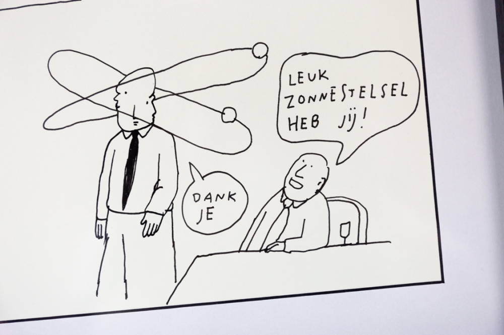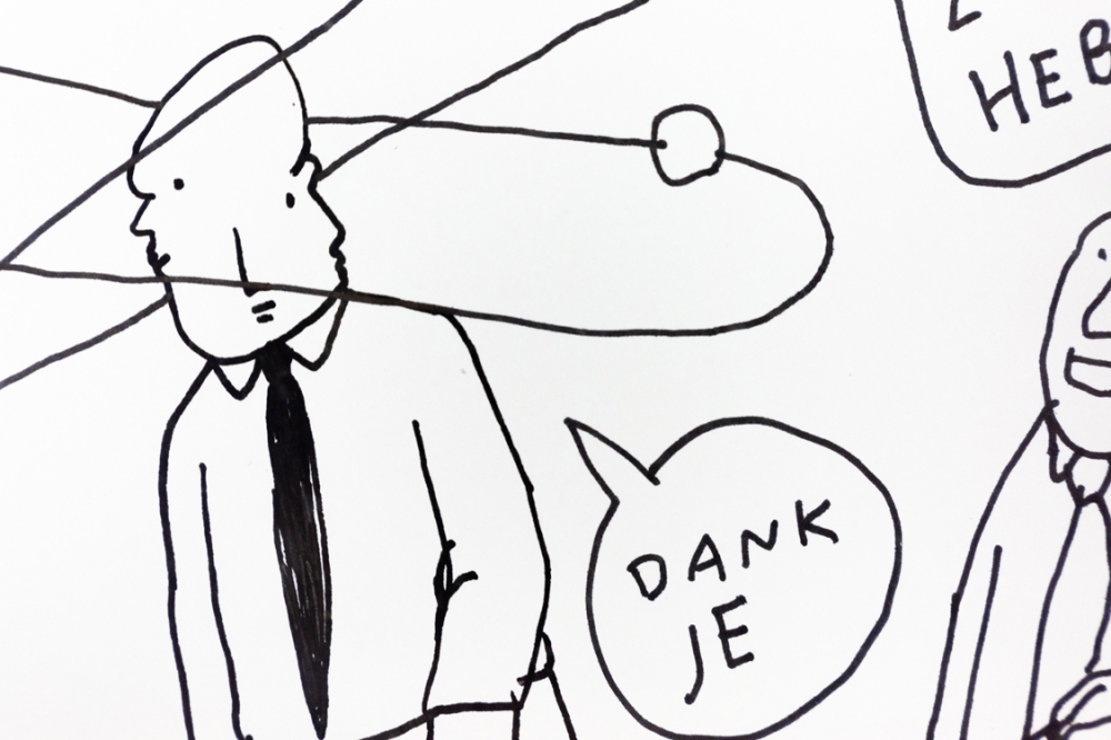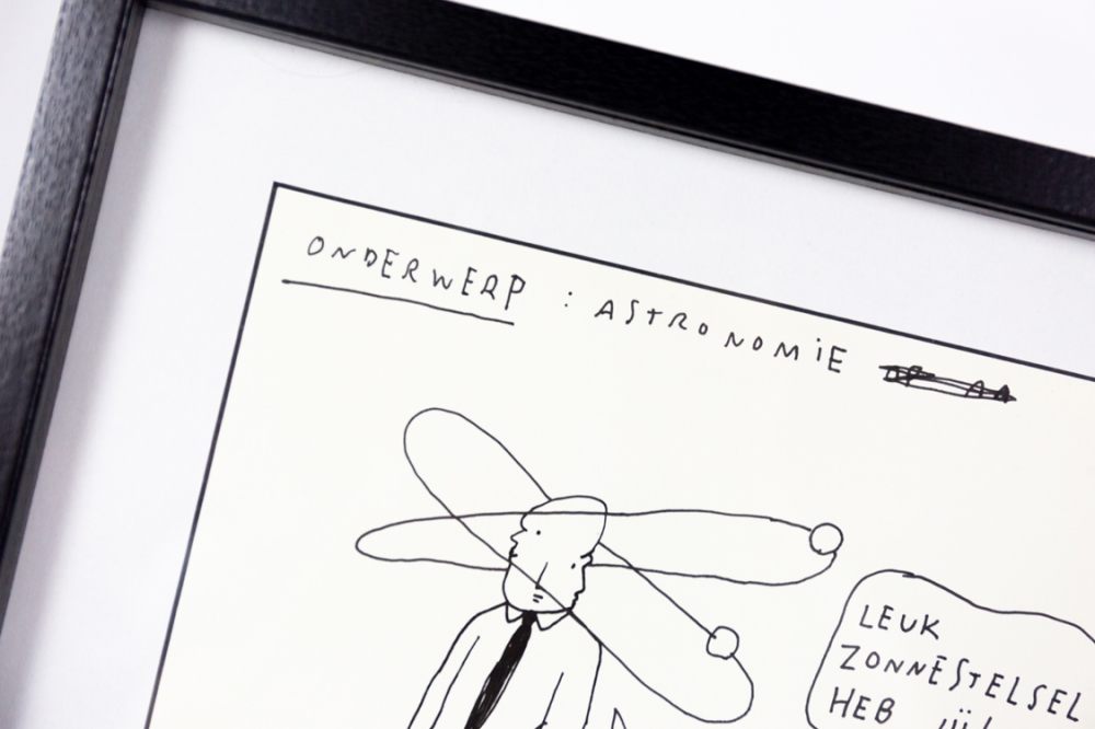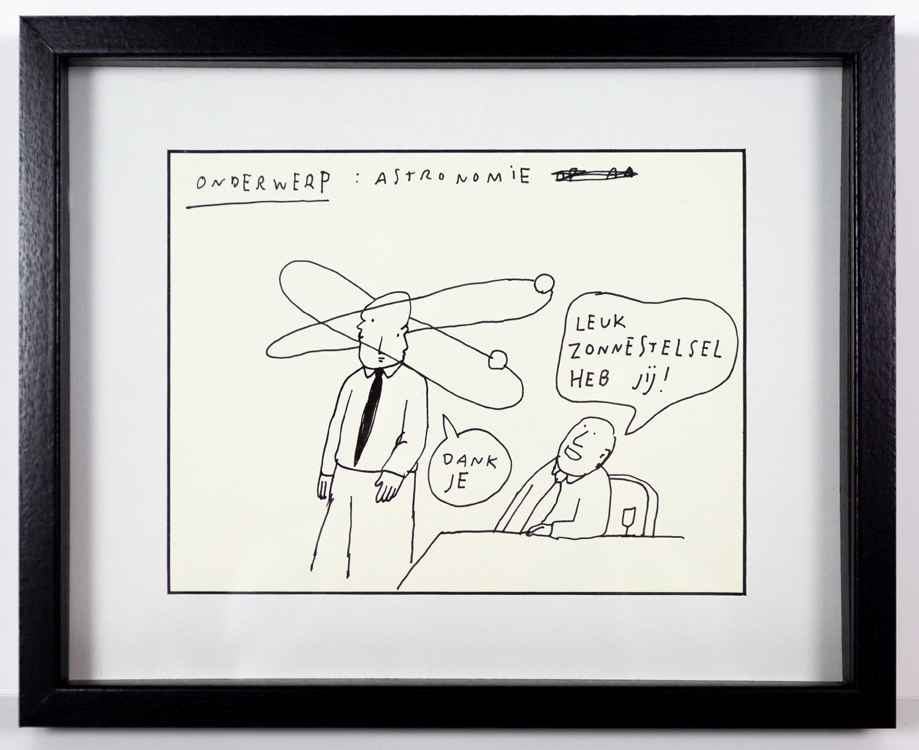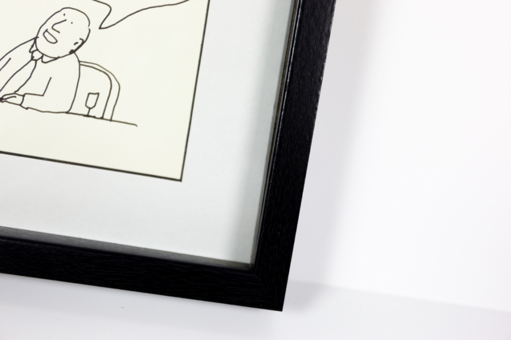 Originele tekening op papier van Kamagurka. Ingelijst in een sober zwarte kader met witte passe-partout en een zwart randje.
