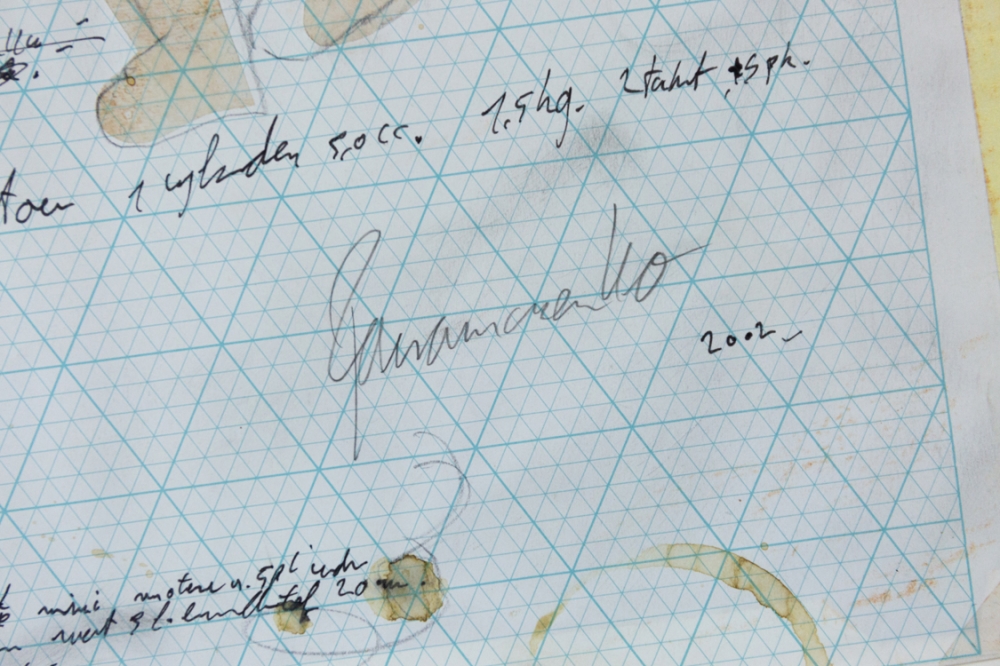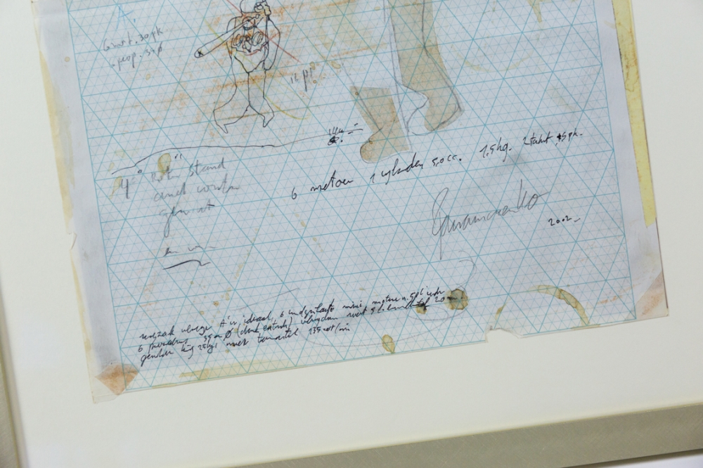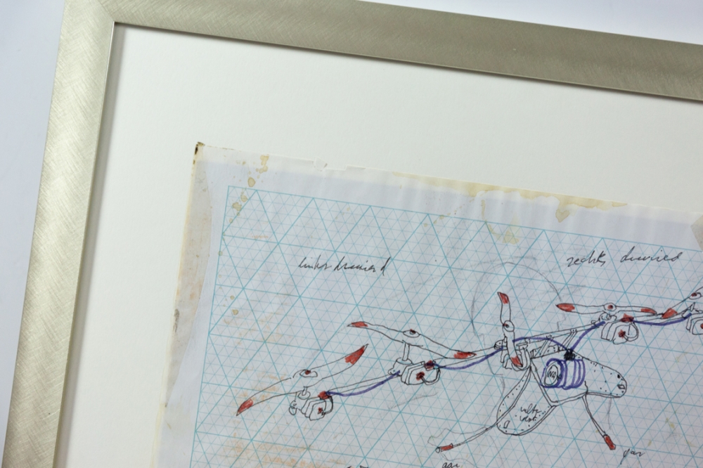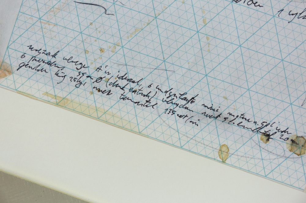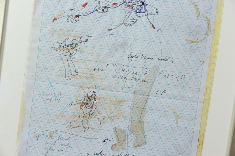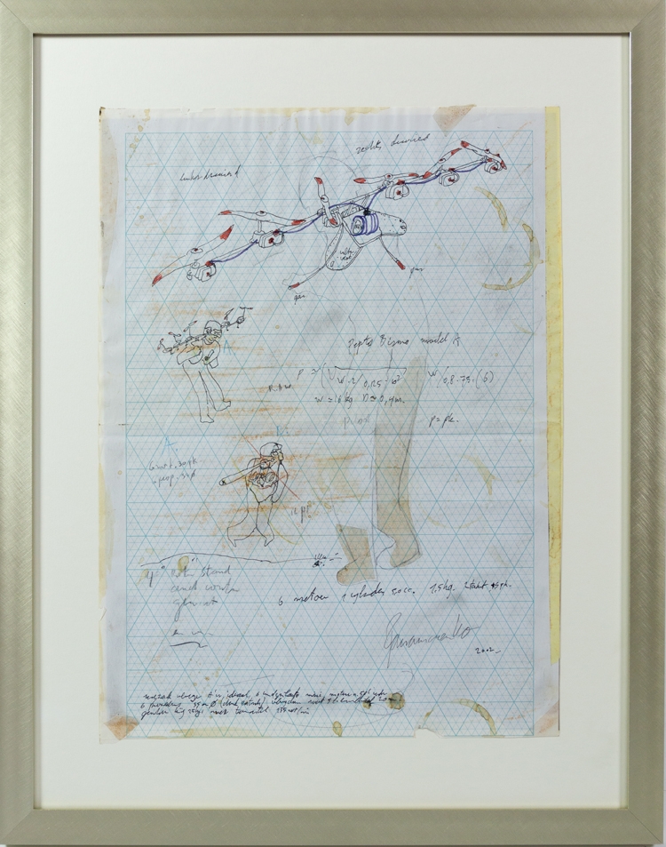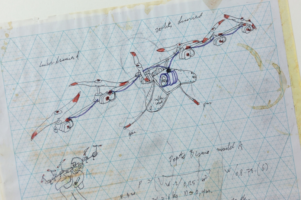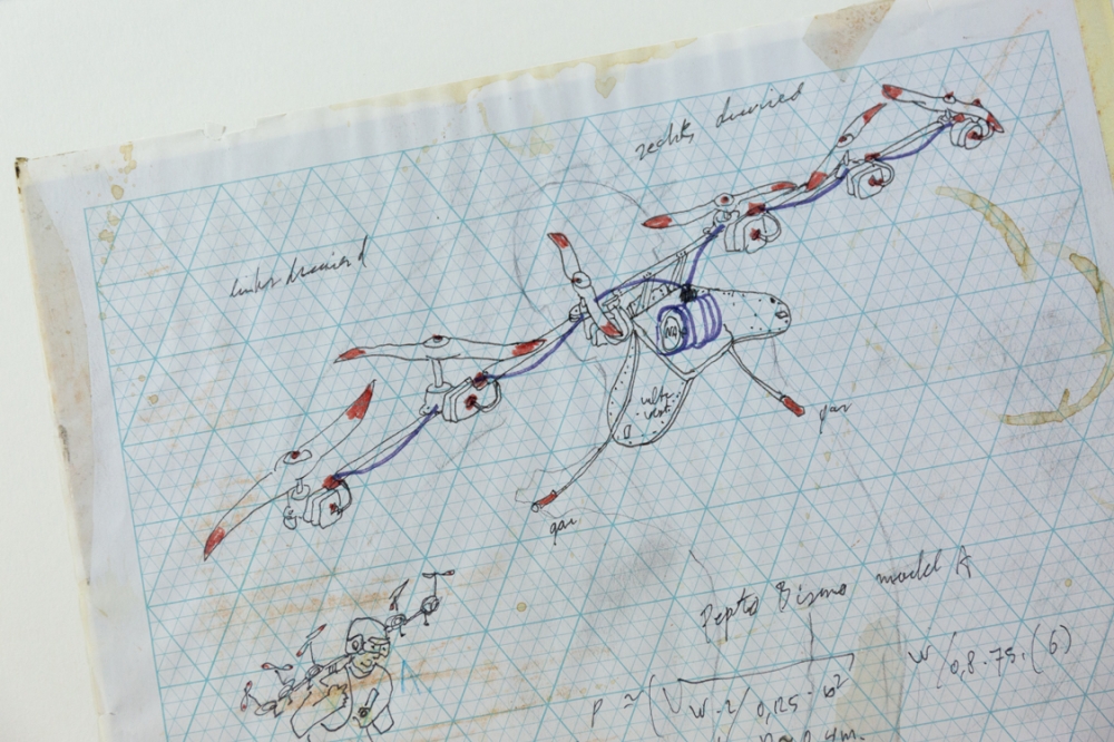 Original, unique drawing on sketch paper by Panamarenko. The drawing shows the design of Pepto Bismo model A.