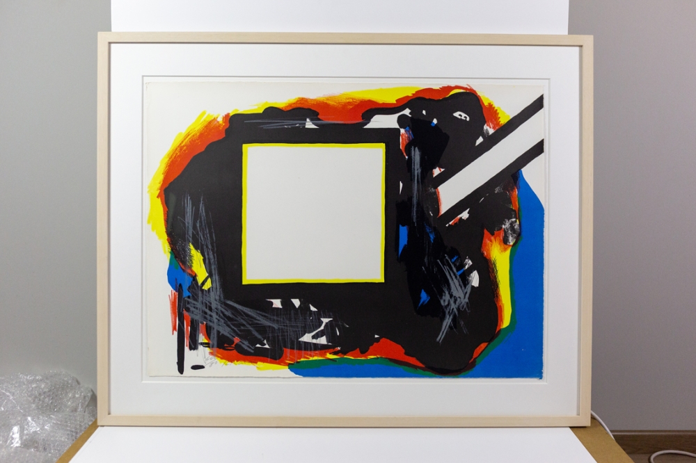 The work is properly framed in a wood-coloured frame, with anti-reflective museum glass. Both work and frame are in excellent condition.