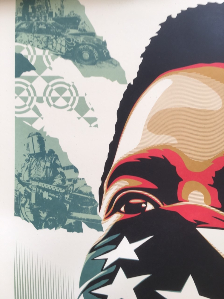 This Lithograph is by Shepard Fairey . This artist achieved great fame in 2008 when he designed the 'Hope' and 'Vote' election posters of Barack Obama.