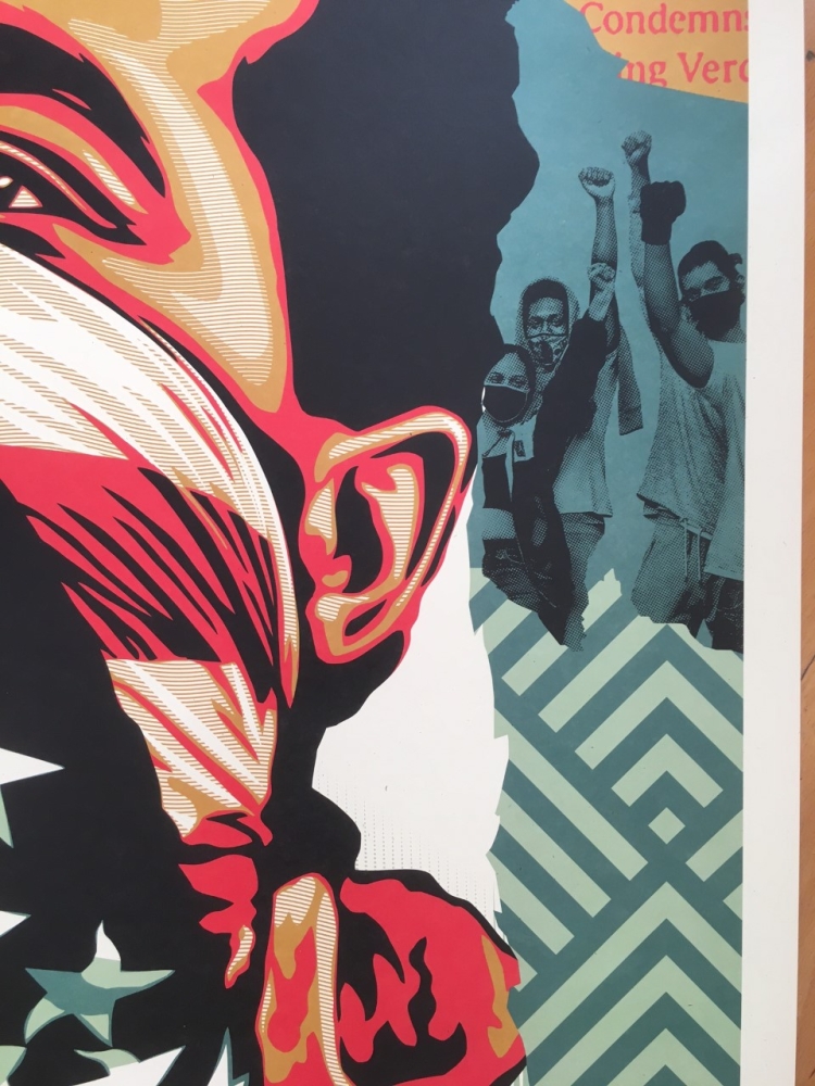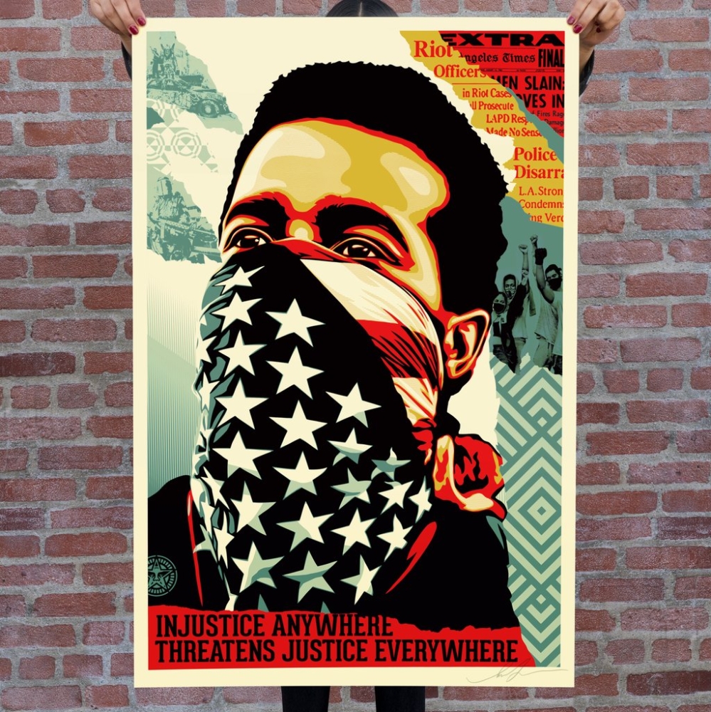 This 'American Rage' lithograph is based on a photo of Ted Soqui, taken during Black Lives Matter protest on August 15, 2014. The movement was one year old at the time and protests against the shooting of an unarmed black man by the LAPD. The statue still symbolizes the current protests in the US.