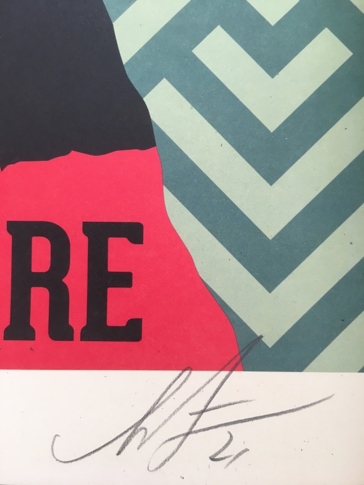 Shepard Fairey signed this lithograph by hand, at the bottom right of the front cover of the work.