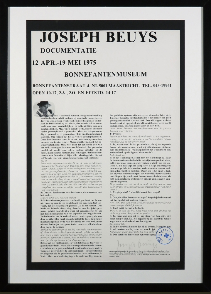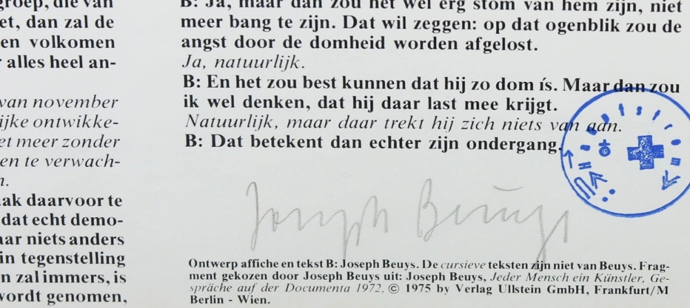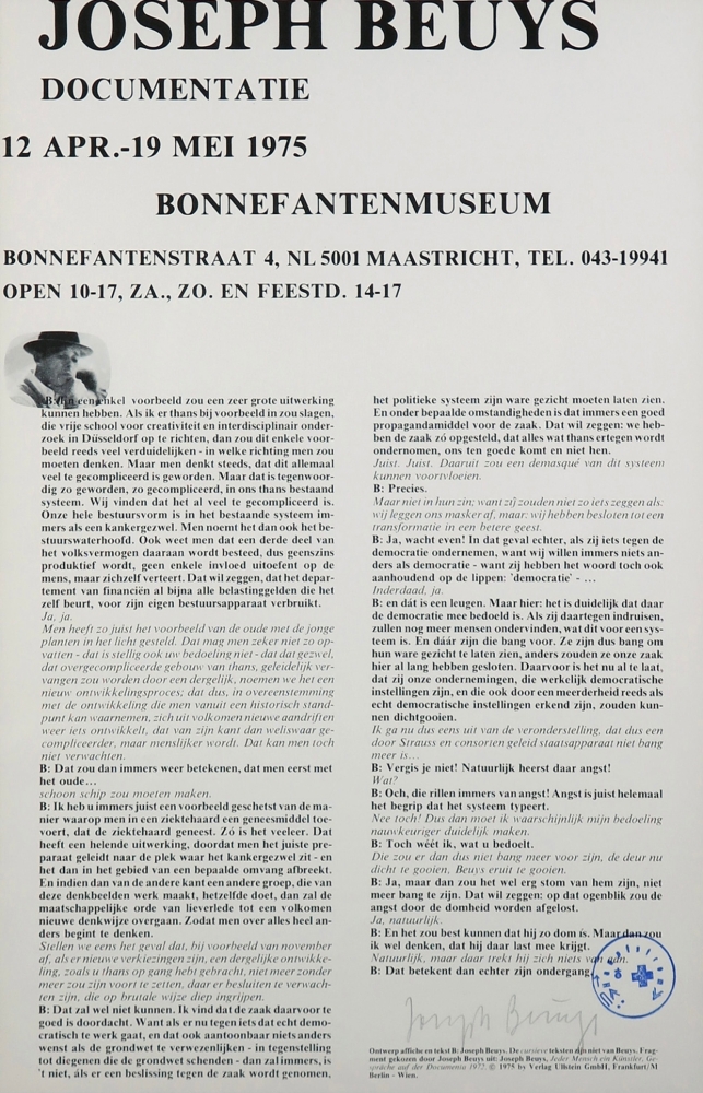 Dit is een affichelitho die Joseph Beuys heeft uitgegeven voor de tentoonstelling in het Bonnefantenmuseum te Maastricht. Het werk toont fragmenten uit een interview met Joseph Beuys in 1972. Het is gedrukt in 1975. Derk mooi ingelijst. Gesigneerd en gestempeld