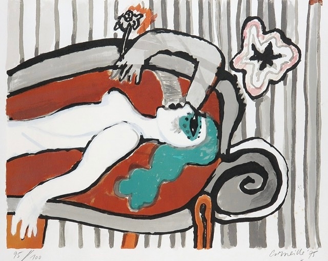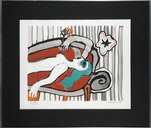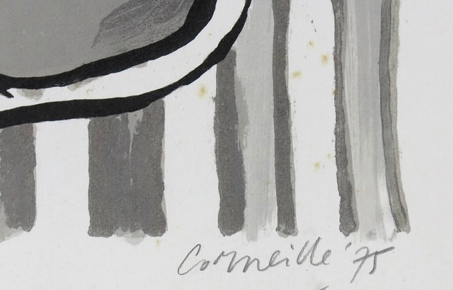 Luxe ingelijste zeefdruk met zwart linnen passe-partout, uit de serie Journal de la Tour / Diario de la Torre. De serie is vervaardigd voor het gelijknamige boek uit 1975. Corneille heeft voor deze uitgave 67 gouaches vervaardigd, welke het boek illustreren. Daarnaast zijn deze gouaches als zeefdruk uitgegeven in een oplage van 100 genummerde exemplaren en 16 épreuves d'artistes. Gedrukt op Fabriano papier. Literatuur: Donkersloot nr. 411.