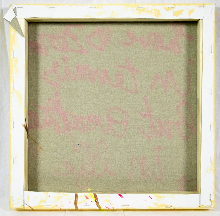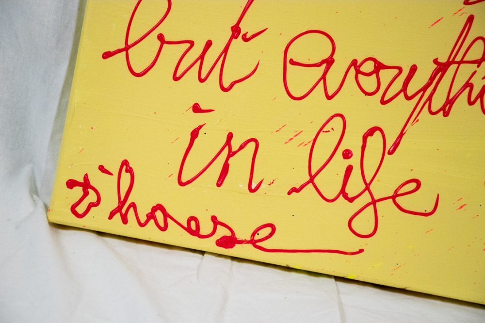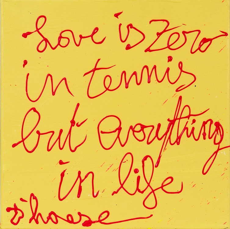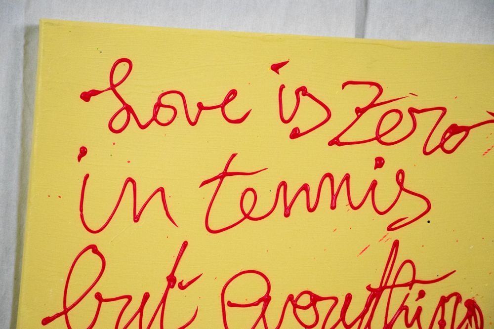 Acrylverfschilderij van Hannes D'Haese met als opschrift: "Love is zero in tennis".