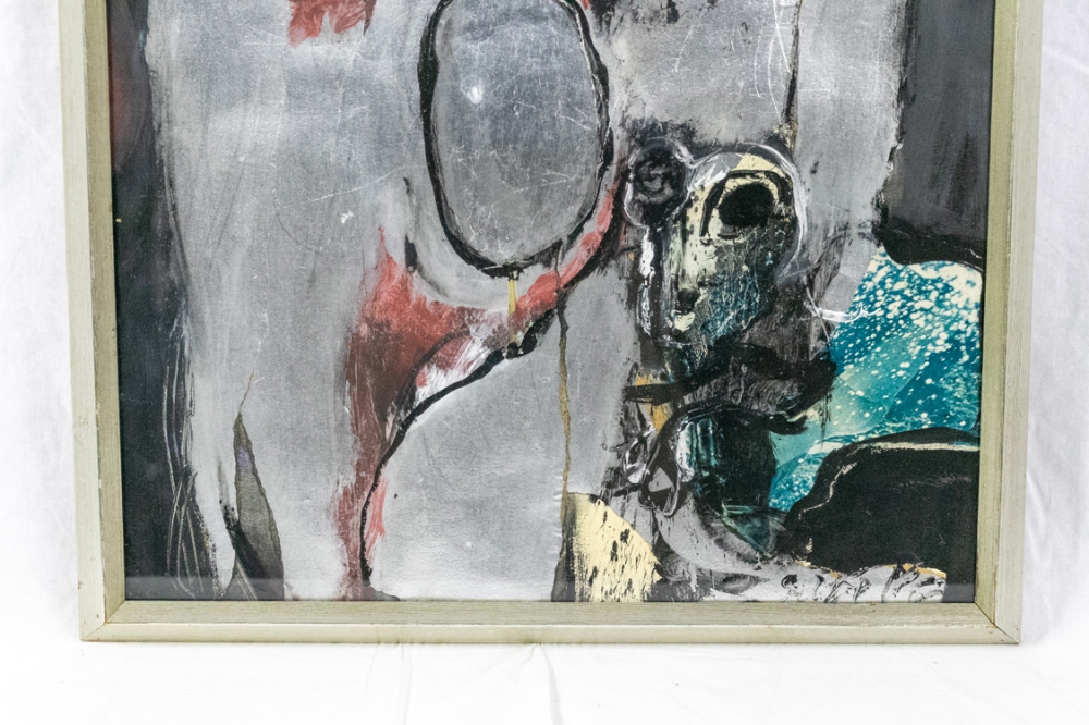 Gemengde techniek met verf op papier. Er zijn op het werk twee verschillende papiersoorten (1 gewoon, 1 zilverkleurig) die m.b.v. collage en aanvulling met verf het beeld vormen.