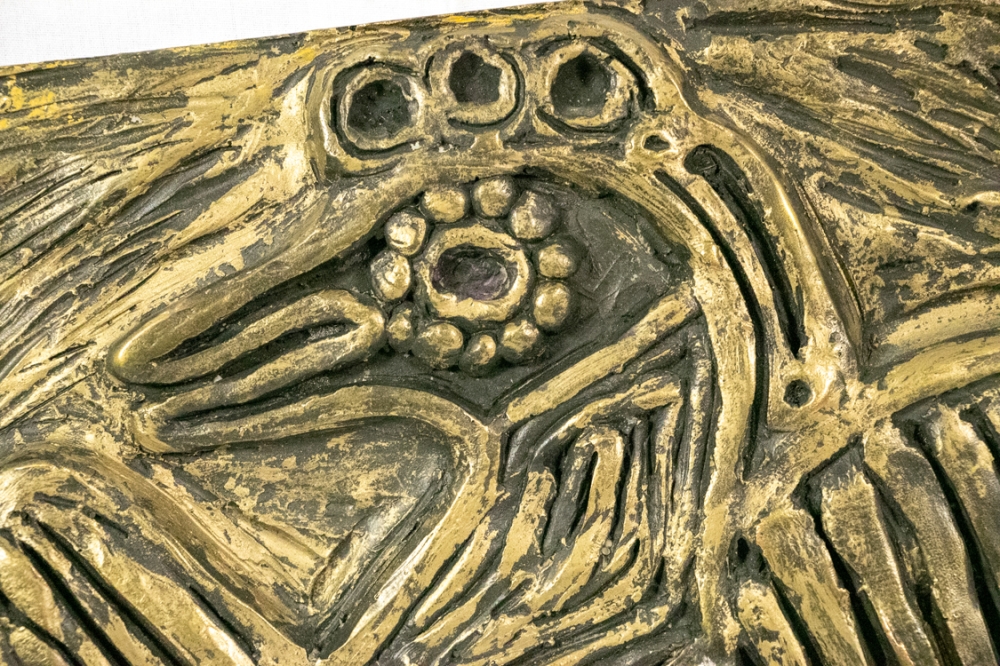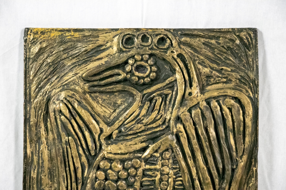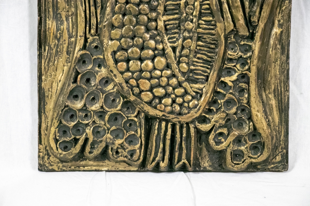 Bas relief in composiet of kunsthars, gemaakt met een bronskleurige uitstraling. Onderaan gesigneerd in het werk, zie laatste foto.
