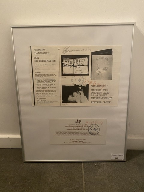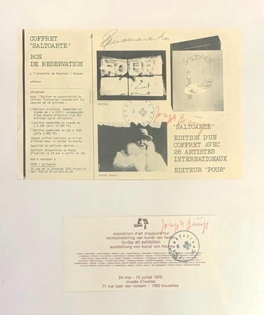 2-part work by Panamarenko and Joseph Beuys, signed by both. The highest is a purchase receipt from 1975 For Saltoarte, an edition card issued in 1975. Said to meet 21 x 31 cm. The lower part is an invitation to the exhibition "Kunst van Heden" in 1975.