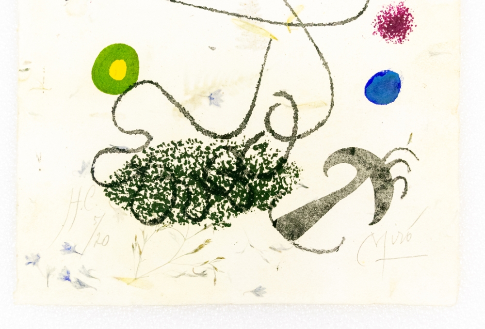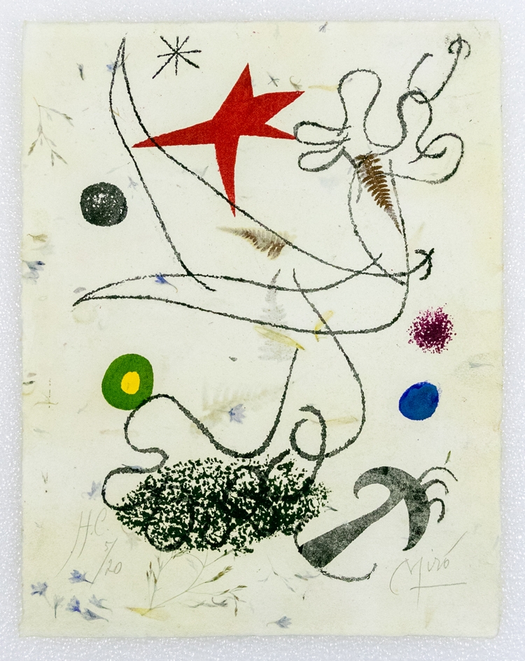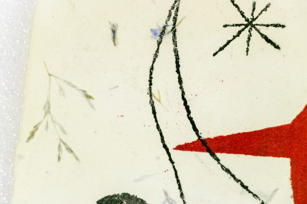 A very special and rare lithograph on handmade Auvergne, Richard de Bas paper. Includes pressed petals, frond tips and grasses. Each sheet is unique. Printed by Mourlot, Paris 1960. Published for the album 'Mavena' with poetry by his friend Radovan Ivsic. Signed in pencil. No. 5/20 HC. The regular edition was 75 impressions. The publishers, Éditions Surréalistes, were interested in recalling the pre-war period of surrealism. When the random effects of the flowers were shown to Miro in the specially created paper, he discovered that they miraculously re-stimulated the elements of subconscious form creation that had infused his surrealist work from the 1930s. Ref: Mourlot 270 (MA202) Cramer 61 Full sheet 33.5 x 25.5 cm. Beautiful impression with strong colors. In very good condition.