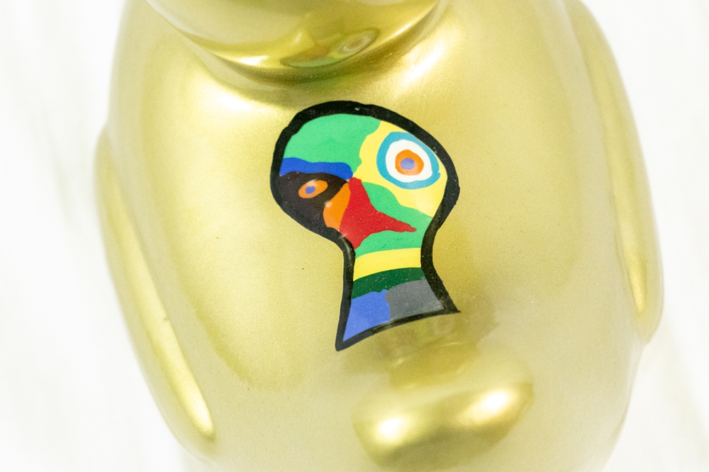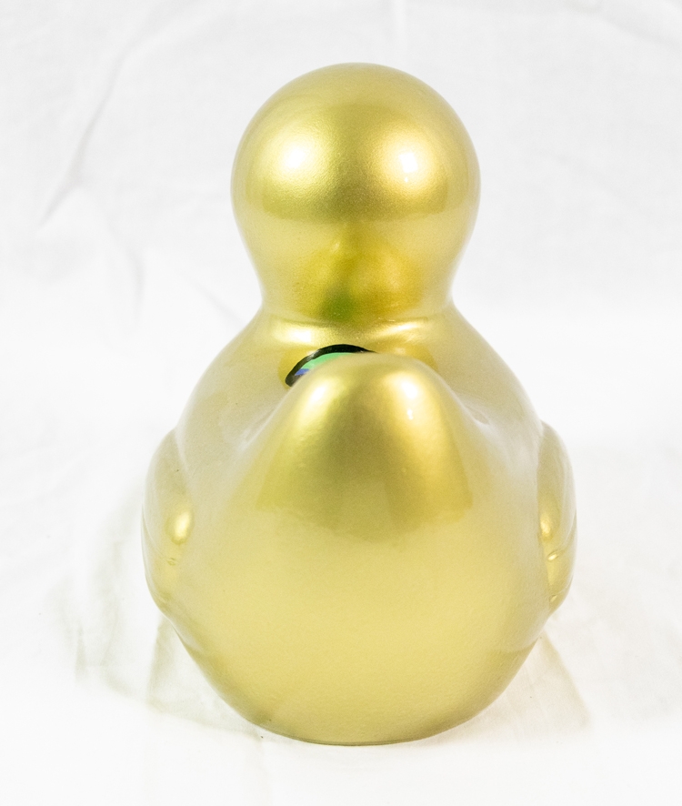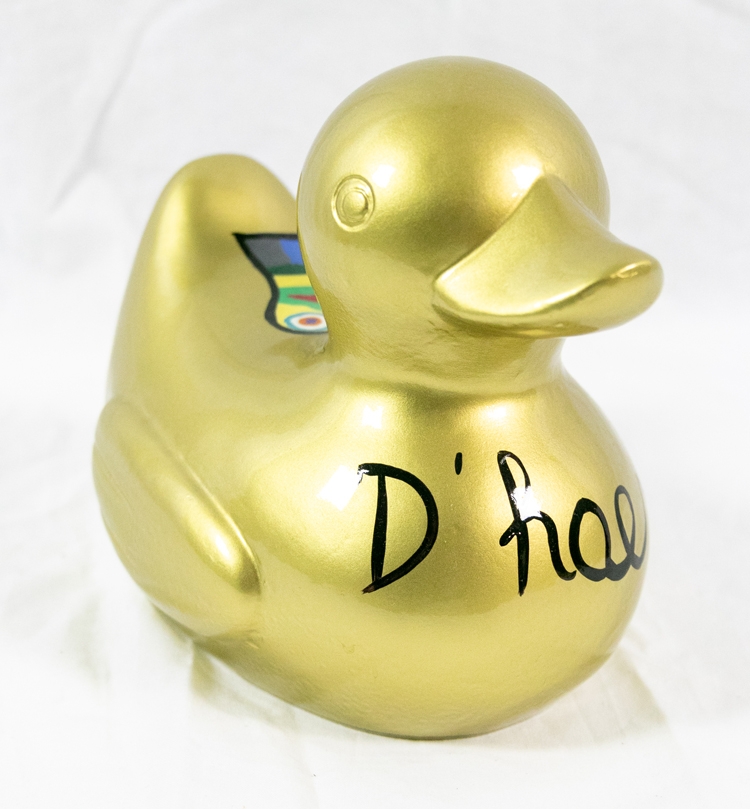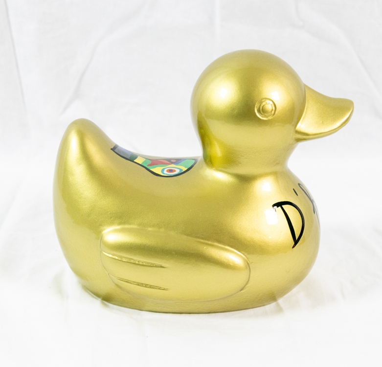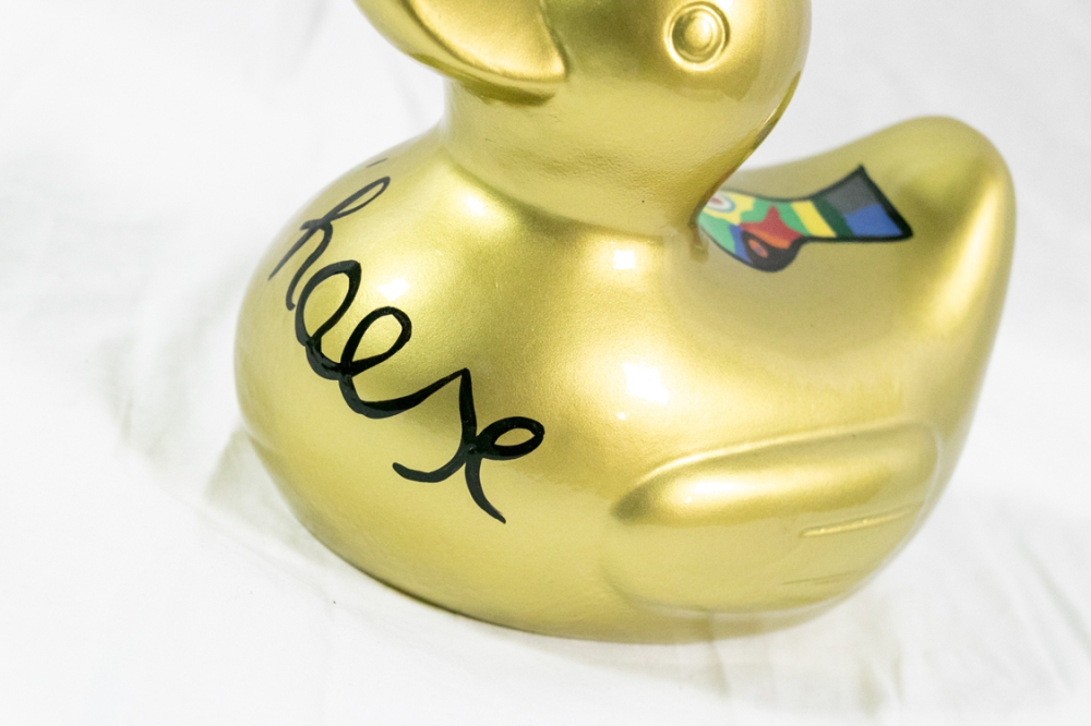 Resin sculpture by Hannes D'haese, in the shape of a golden duck. On the back a painting and on the front the signature.