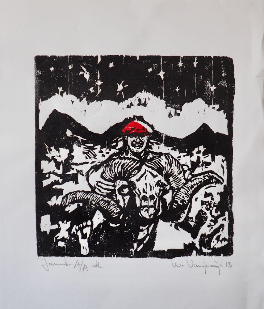 Afdruk op papier van houtsnede Willy van Parijs. Stel Janneke Dams, een volksfiguur uit Zonhoven voor met de rode pet. Afdruk met nummer 13. Aangeboden door een van onze leden. Afm. 35 x 35 cm op papier 50 x 63 cm.