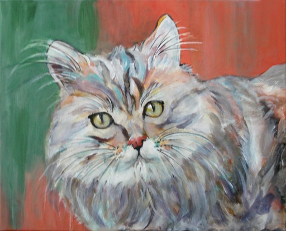 Niet gesigneerd werk van Martine Taffein, stelt een mooie afbeelding van een kat voor welke met haar lichtgroene ogen de wereld aankijkt. De licht gevlekte kleuren van de kat steken mooi af op de rood groene achtergrond van de kamer.