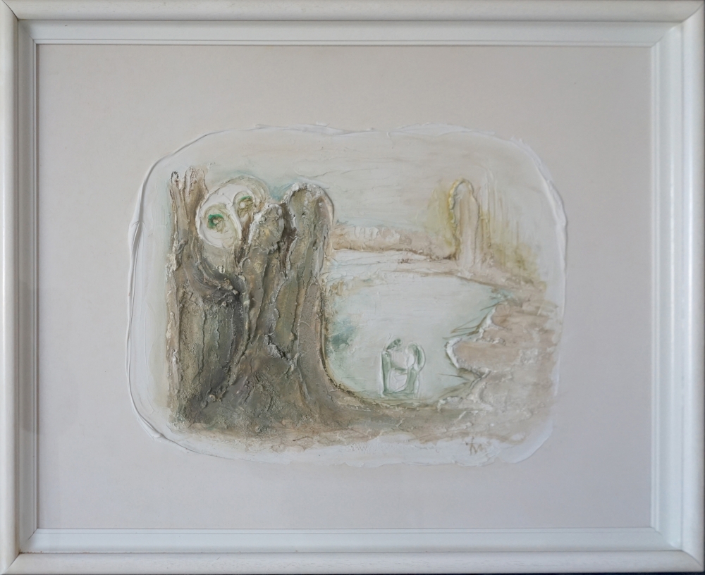 Uilennest, werk van Toon Vanmechelen, vader van Koen Vanmechelen, schilder beeldhouwer autodidact. In reliëf geborsteld schilderwerk in glazen kader. In de holle boom aan de rand van de vijver verschuilt zich de uil.