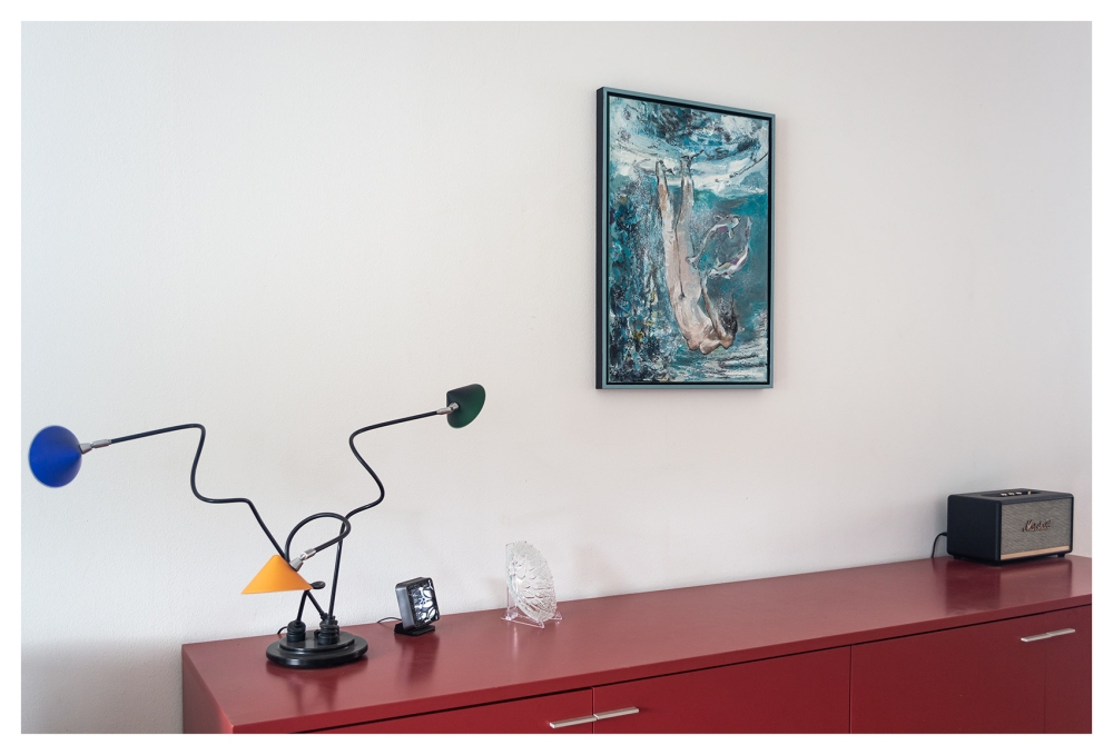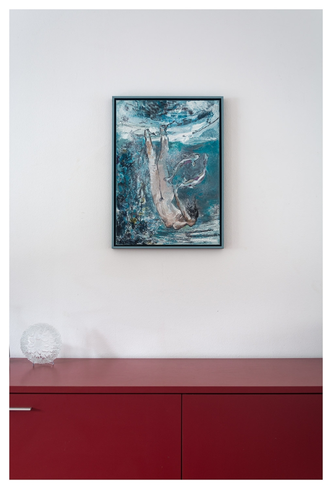 This painting is an oil canvas. A naked woman dives into the water. between the fishes.Mooi atmospheric cloth of 70 x 50 cm. The work is a combination of brush, airbrush and oilsticks. More work by Lambert Oostrum can be seen at: www.lambertoostrum.nl
