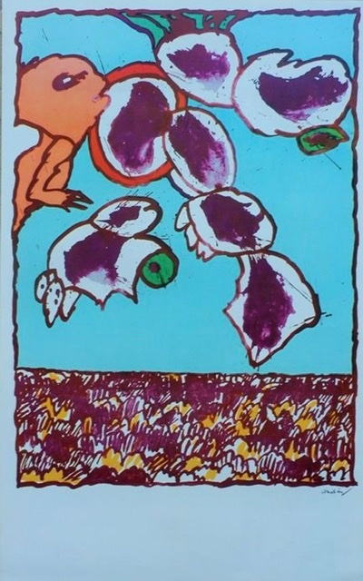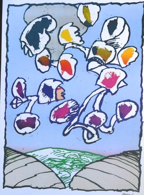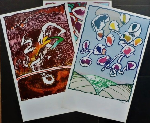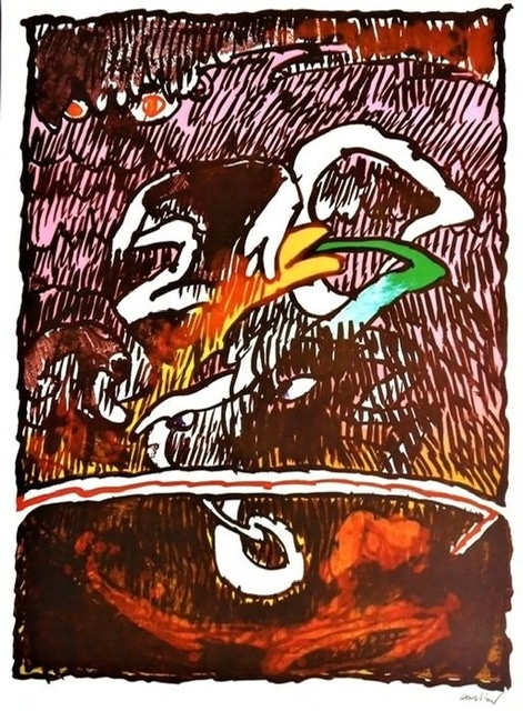 Very special offset lithographs on satin paper. These works are made in the U.S.A. by Alechinsky's publisher after printing the hand-signed copies. There is therefore just as much ink on these offsets as on the serial edition. Alechinsky's signature is placed underneath the work and is therefore also printed. The Offset lithographs are from 1978 and made from the original plates. The titles are: Paris Flying Object--Galactic Flying Object--Great Flying Object. The size is 78 x 48 cm in new condition.