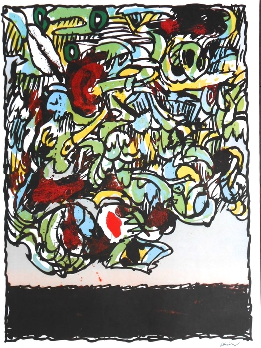Very special color lithographs on satin paper. These works are made in the U.S.A. by Alechinsky's publisher after printing the hand-signed copies. There is therefore just as much ink on these lithographs as on the serial edition. Alechinsky's signature is placed underneath the work and is therefore also printed. The color lithographs are from 1978 and made from the original plates. The titles are: Wordly Flying Object--Galactic Flying Object--Invisible Flying Object. The size is 78 x 48 cm in very good condition. The edition is 100 copies, the works are unnumbered.