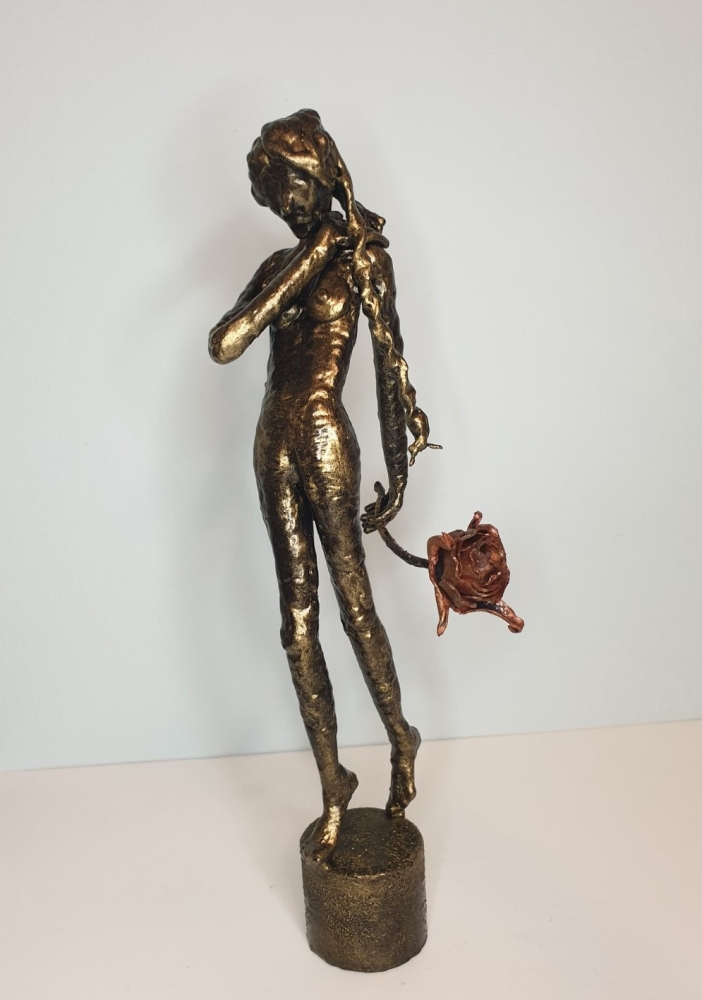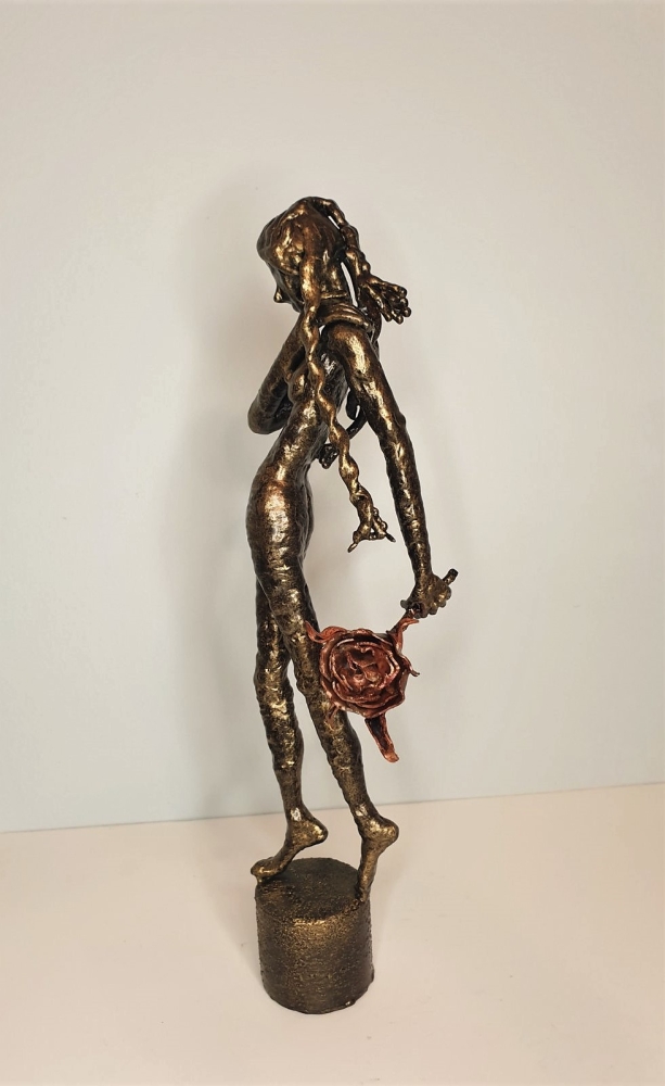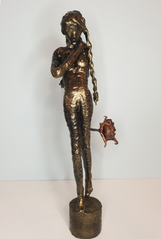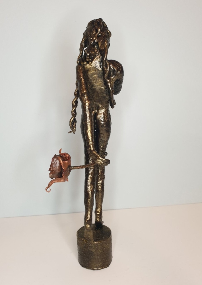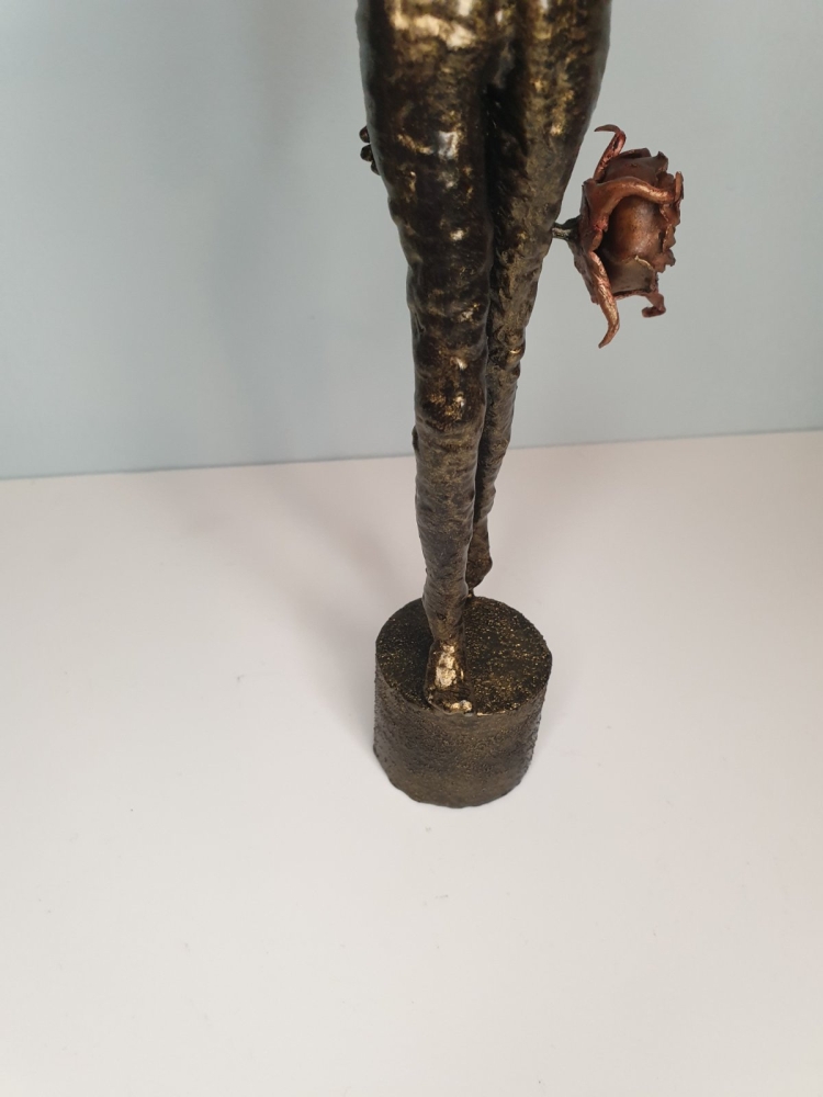 Woman with a copper rose, sculpture from S-art studio. Unique welded and forged metal sculpture,it is not a casting.Material: carbon steel, color: black with golden wax, sprayed with transparent spray for protection. One of a kind work, comes with a certificate of authenticity. IMPORTANT NOTE: SHIPPING TO THE EU ONLY - NO SHIPPING TO NON-EU COUNTRIES.