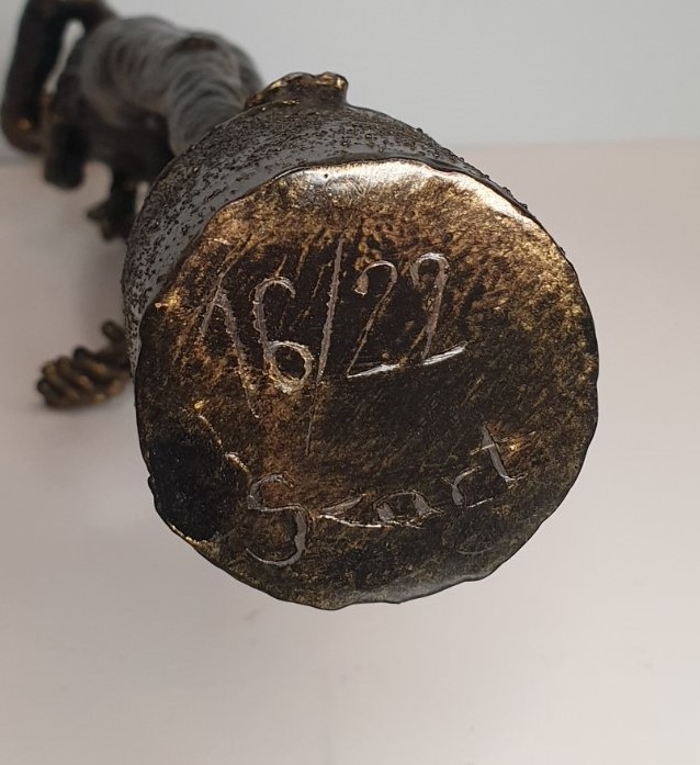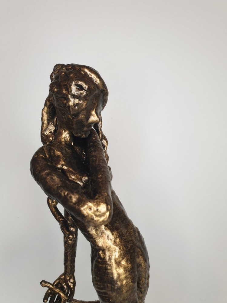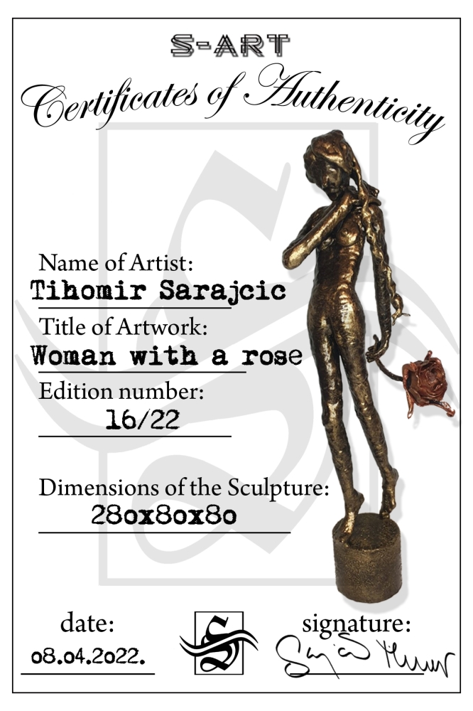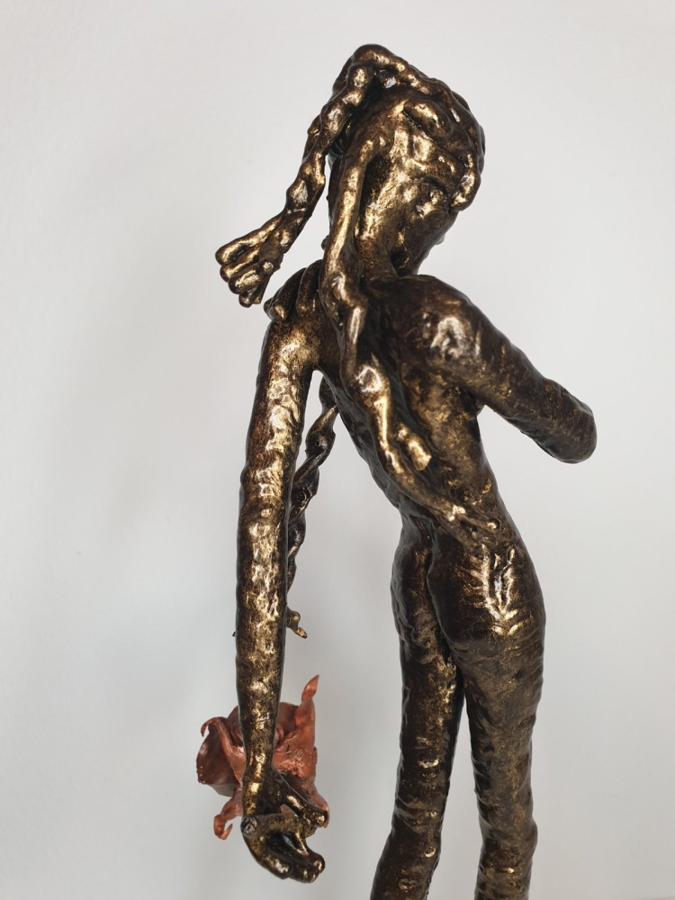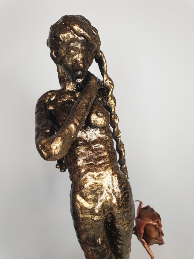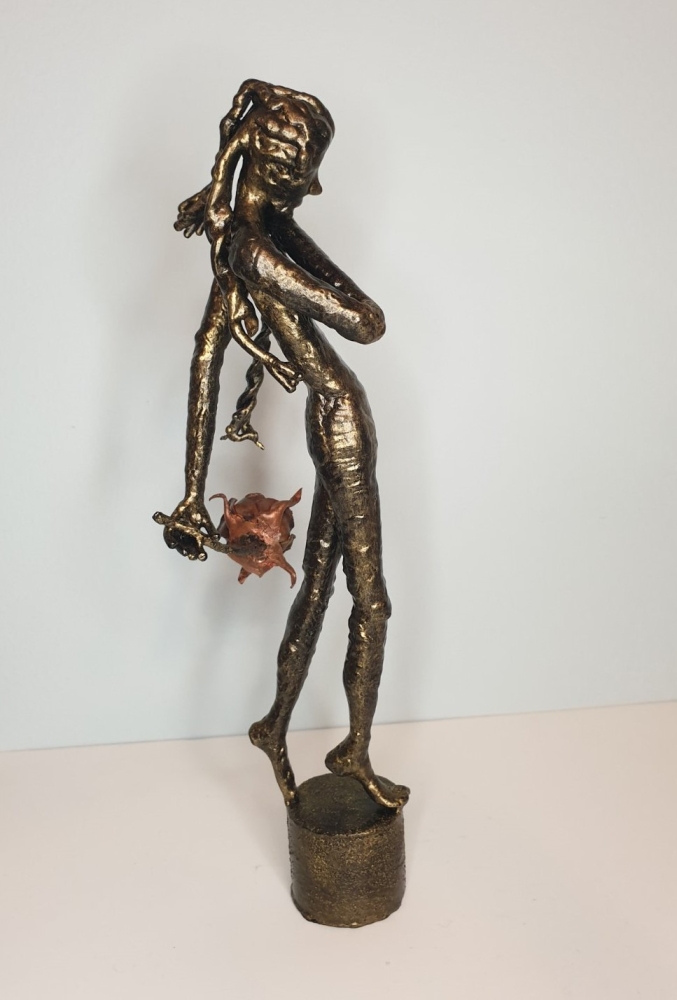 Woman with a copper rose, sculpture from S-art studio. Unique welded and forged metal sculpture,it is not a casting.Material: carbon steel, color: black with golden wax, sprayed with transparent spray for protection. One of a kind work, comes with a certificate of authenticity. IMPORTANT NOTE: SHIPPING TO THE EU ONLY - NO SHIPPING TO NON-EU COUNTRIES.