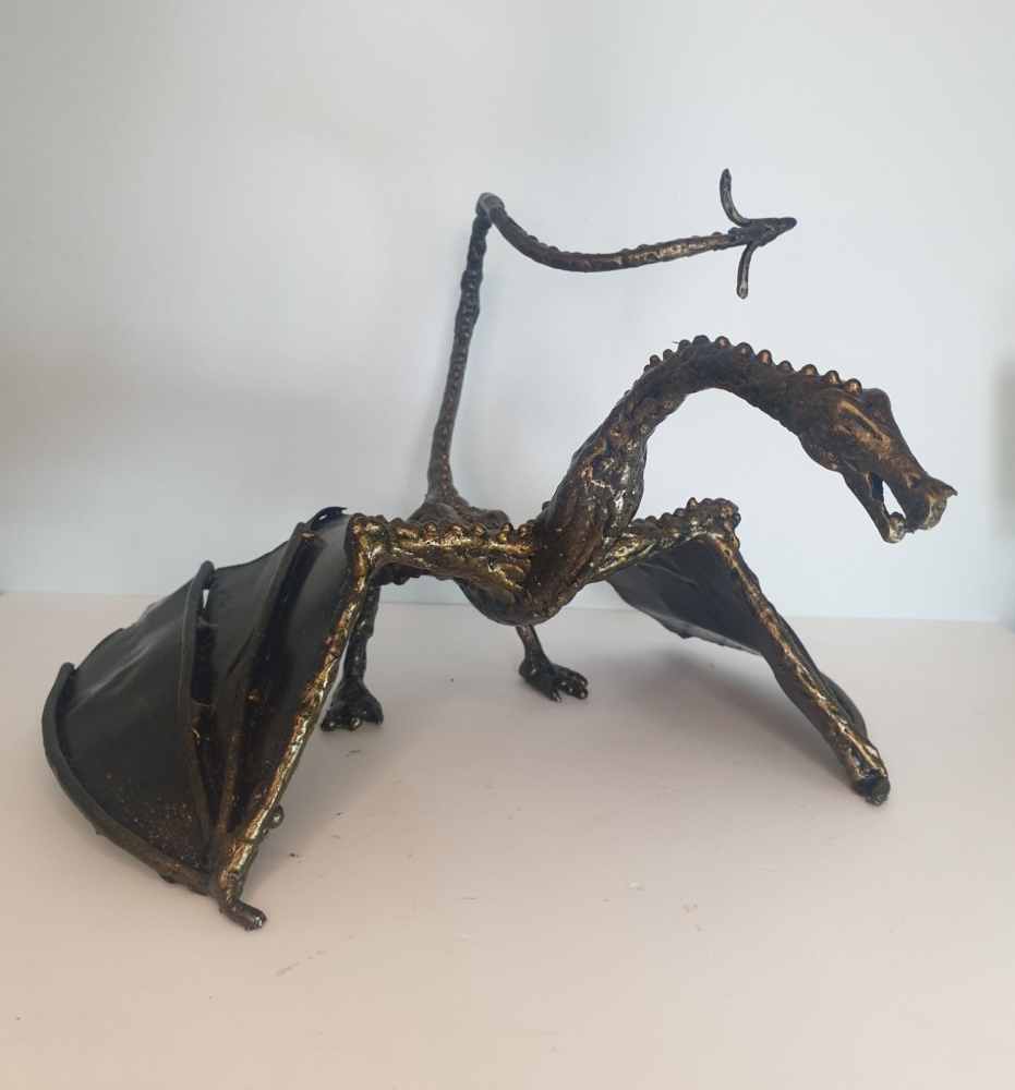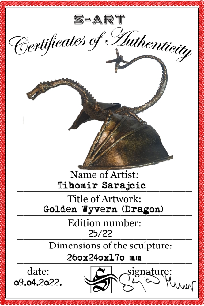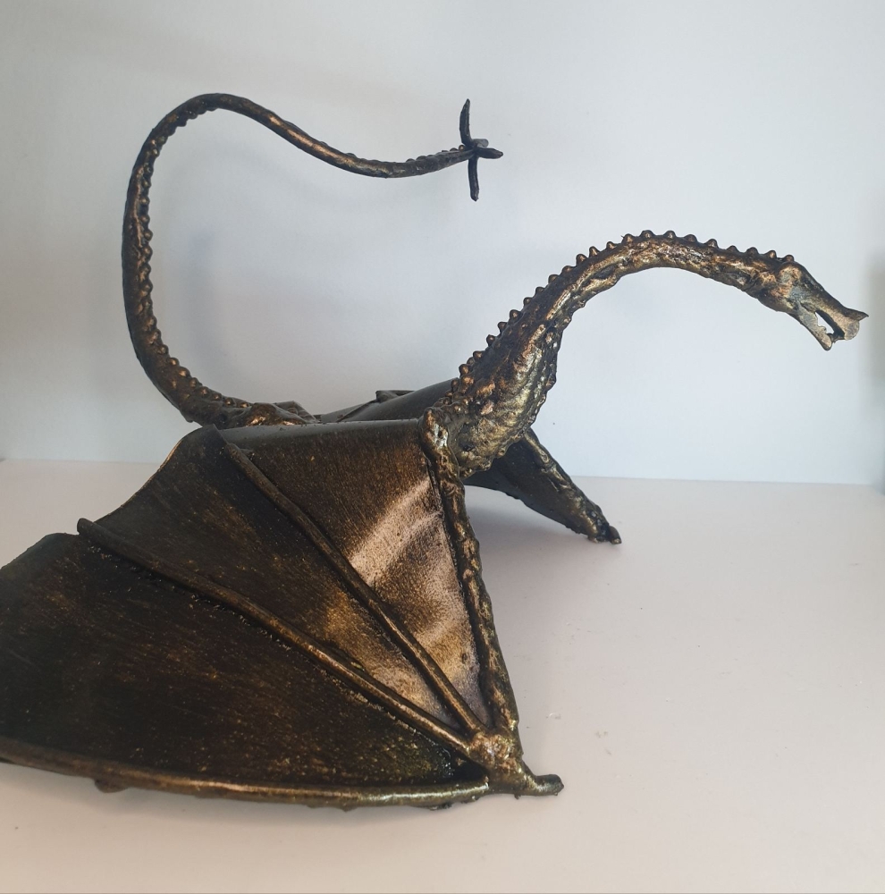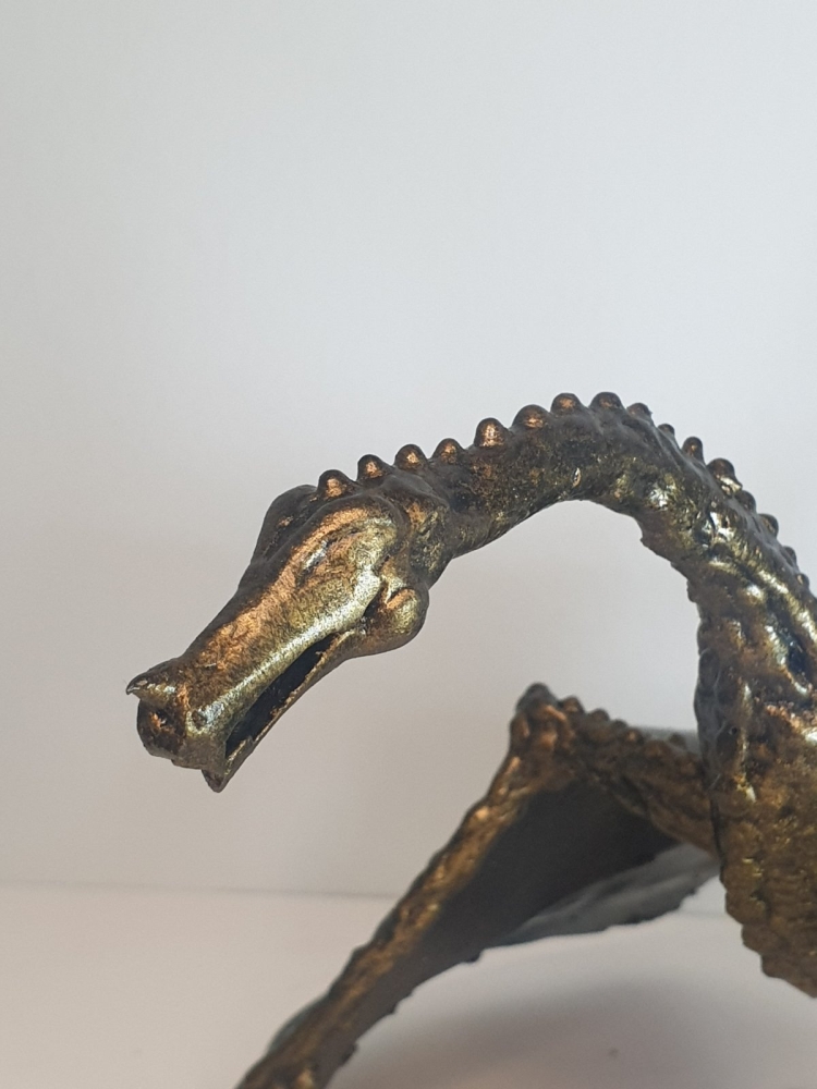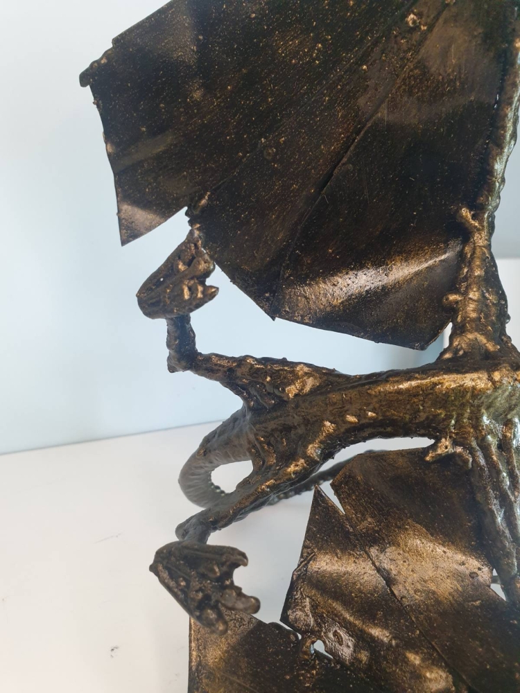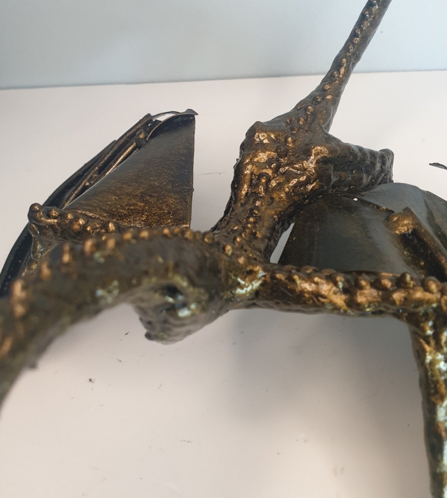 Golden Wyvern (Dragon), sculpture from S-art studio. Unique welded and forged metal sculpture,it is not a casting. Material: carbon steel, color: black with golden wax, sprayed with transparent spray for protection. One of a kind work, comes with a certificate of authenticity. IMPORTANT NOTE: SHIPPING TO THE EU ONLY - NO SHIPPING TO NON-EU COUNTRIES.