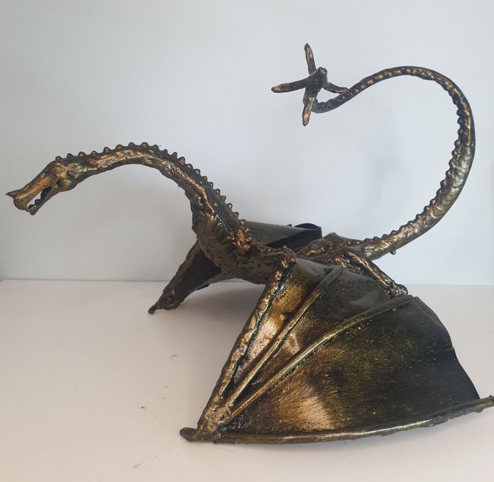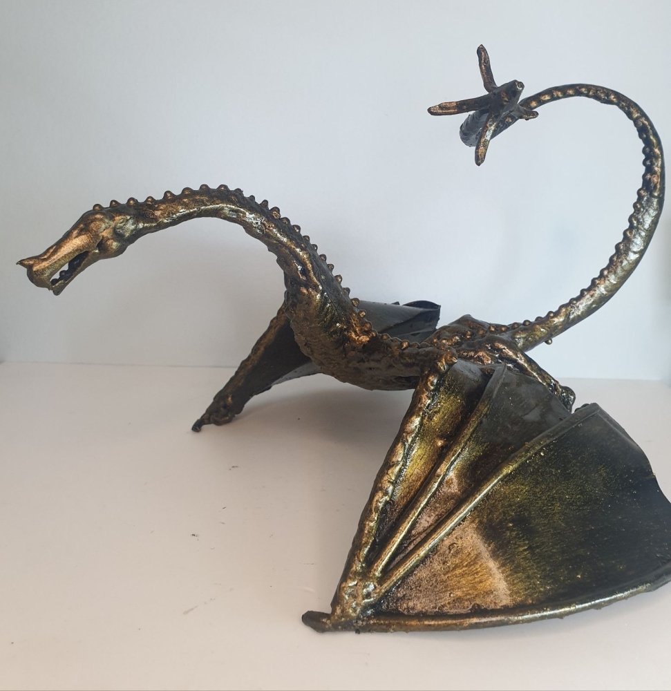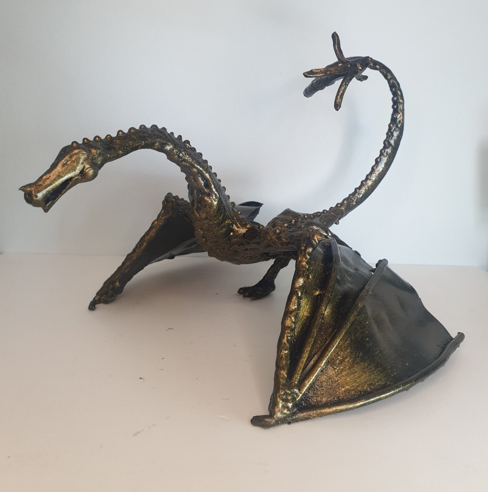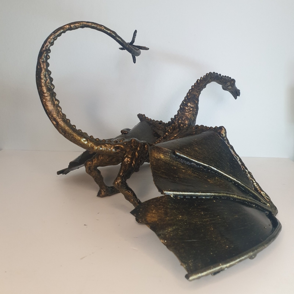 Golden Wyvern (Dragon), sculpture from S-art studio. Unique welded and forged metal sculpture,it is not a casting. Material: carbon steel, color: black with golden wax, sprayed with transparent spray for protection. One of a kind work, comes with a certificate of authenticity. IMPORTANT NOTE: SHIPPING TO THE EU ONLY - NO SHIPPING TO NON-EU COUNTRIES.