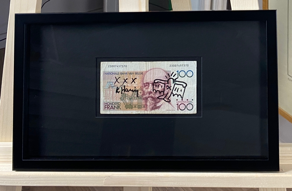 Original drawing by Keith Haring on a 100 BEF note. Also signed. The work is professionally framed. Inspired by the New York City street culture of the 1980s, Keith Haring has been praised for his pop art and graffiti-style work described as a kind of imagery.