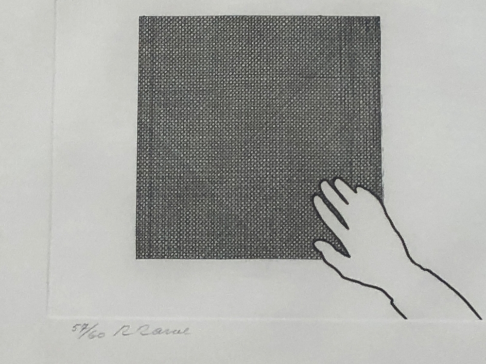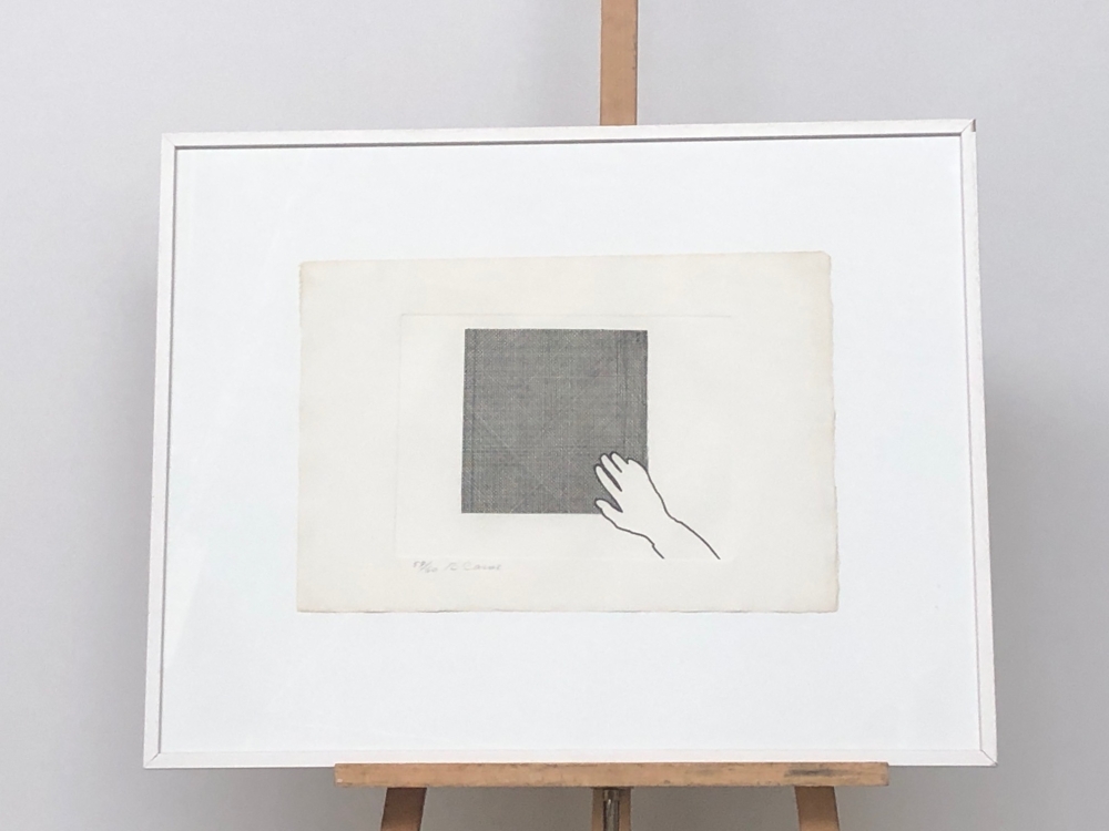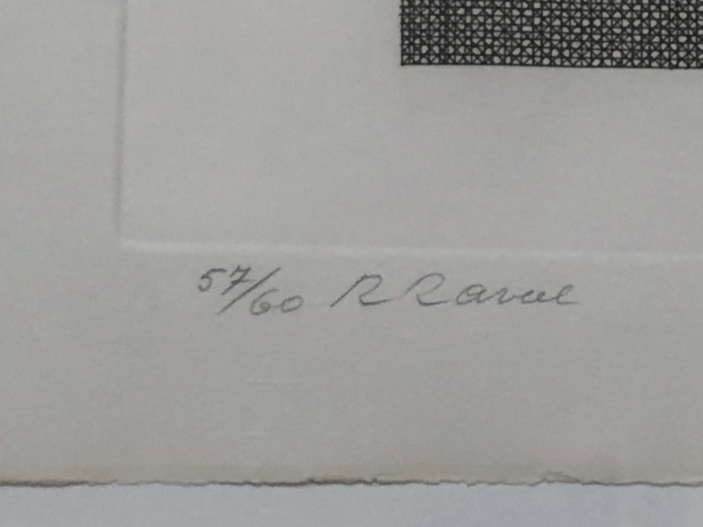Roger Ravel. Black and white etching from a storage box with eight etchings by Roger Raveel and one poem by Roland Jooris. The work is described in the graphic oeuvre under number 20.1 on page 46. This etching is framed with a white frame and a background. The work is in good condition. It will be packed tightly when shipped.