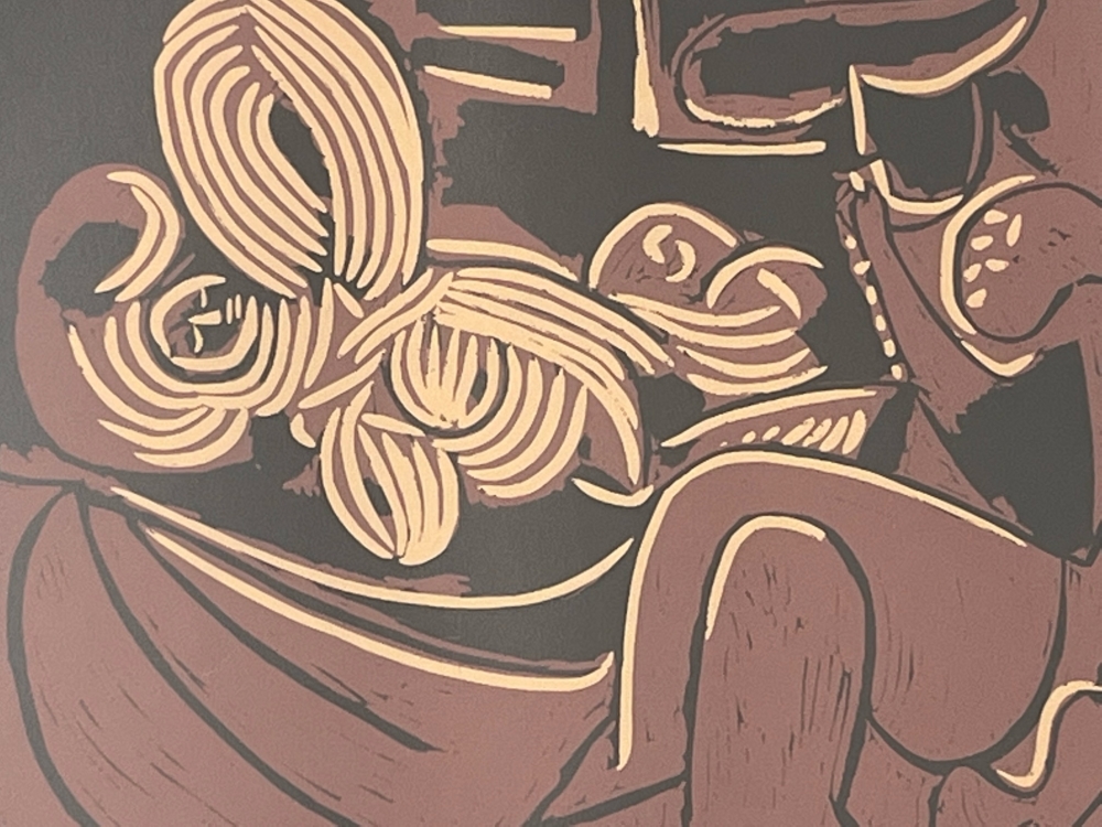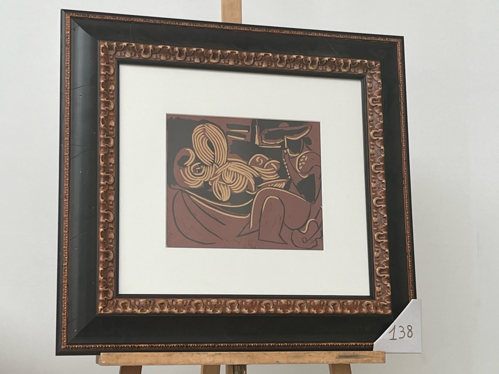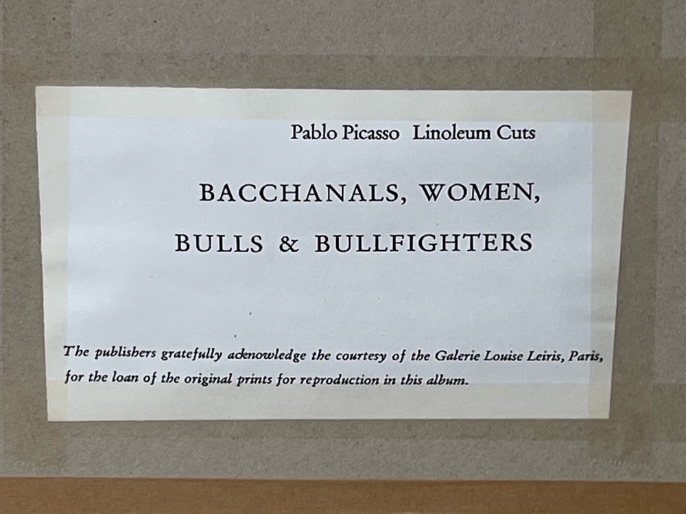 1881 - 1973 "bulls & bullfighters" linoleum cut after picasso that is unsigned the publishers gratefully acknowledge the courtesy of the galerie Louise Leiris, Paris, for the loan of the original print for reproduction discription at the back framed and in good condition size of the cut 26cm x 32cm size with frame 68cm x 73cm