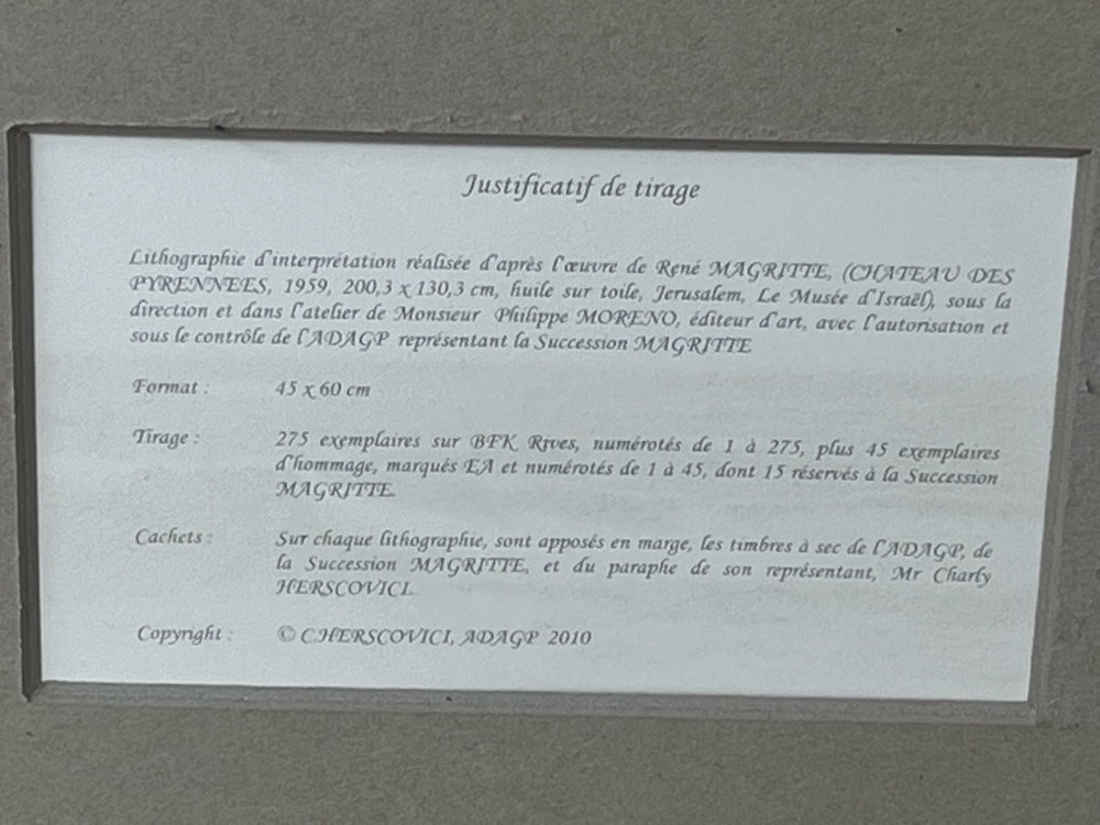 "Chateau des pyrennes" 1959 ex. 116/275 original signed by C. Hersovici Litho is framed and in very good condition there are 2 litlle stamps in the front and 1 big stamp at the back with discription