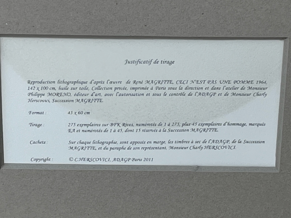 "Ceci n'est pas une pomme" 1964 ex. 170/275 original signed by C. Hersovici Litho is framed and in very good condition there are 2 litlle stamps in the front and 1 big stamp at the back with discription