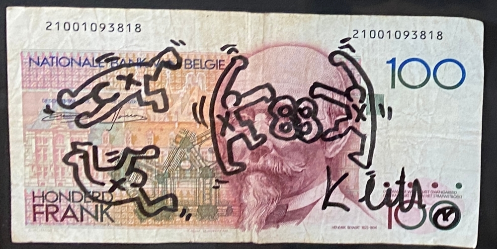 Original drawing by Keith Haring on a 100 BEF note. Also signed. The work is professionally framed. Inspired by the New York City street culture of the 1980s, Keith Haring has been praised for his pop art and graffiti-style work described as a kind of imagery.