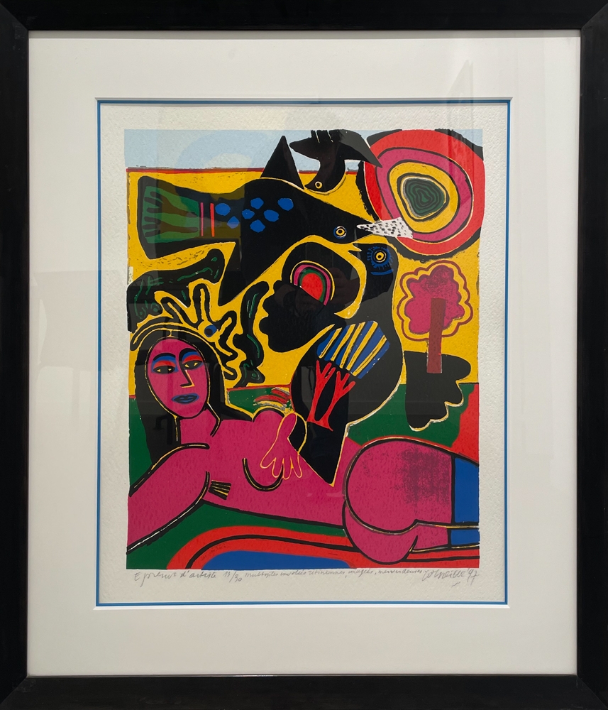 Zeefdruk van Corneille getekend en genummerd in potlood in een zeer kleine oplage van 30 stuks. Het werk is in perfecte staat. Het is ingelijst, de zwarte houten omlijsting heeft enkele minimale opmerkingen.