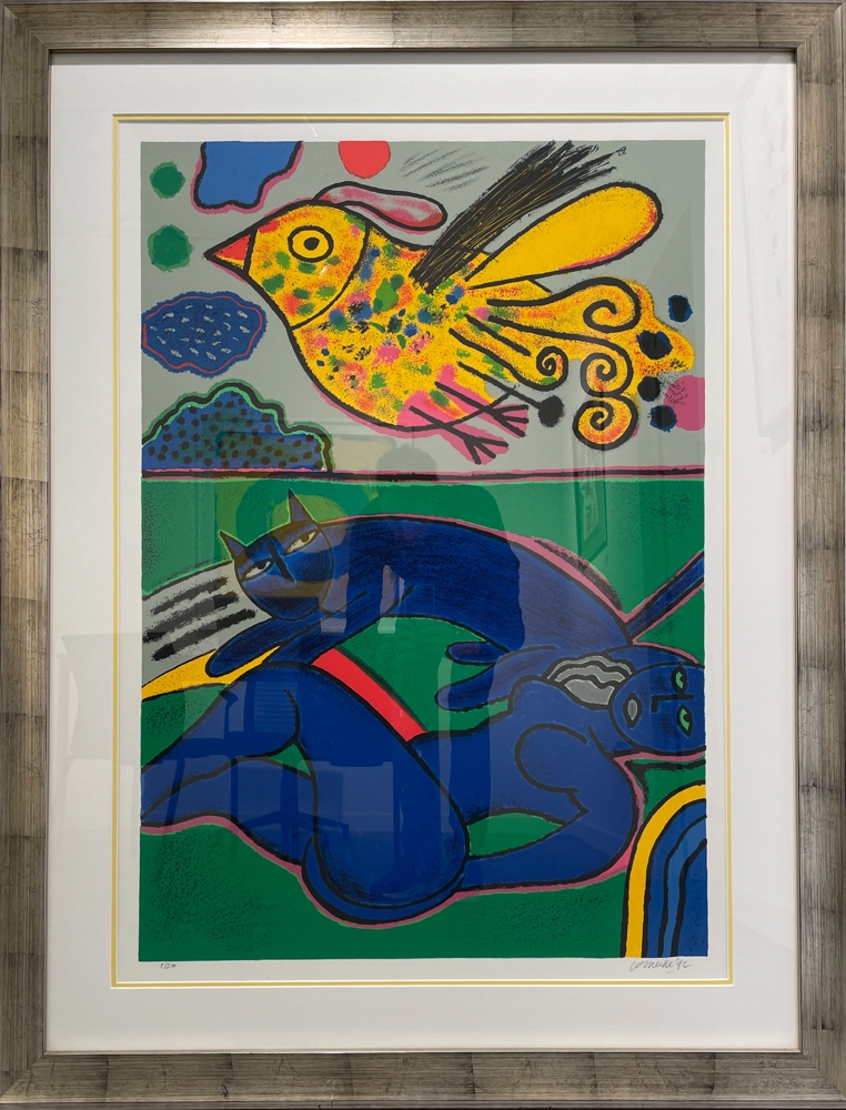 Zeer grote indrukwekkende zeefdruk van Corneille. Getekend, genummerd en gedateerd onderaan in potlood door Corneille. Het aangeboden kavel is nr. 1/200 Het werk is ingelijst, lijst en werk in prima staat. Het werk is uitgegeven door GKM in Zweden https://www.gkm.se/product/le-doux-felin-de-lete/