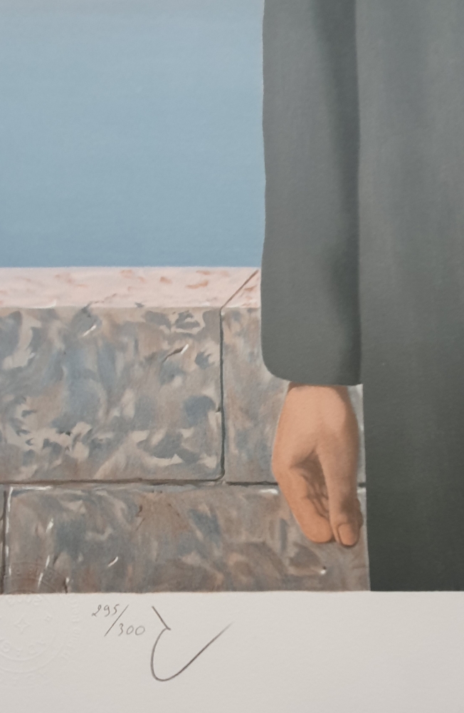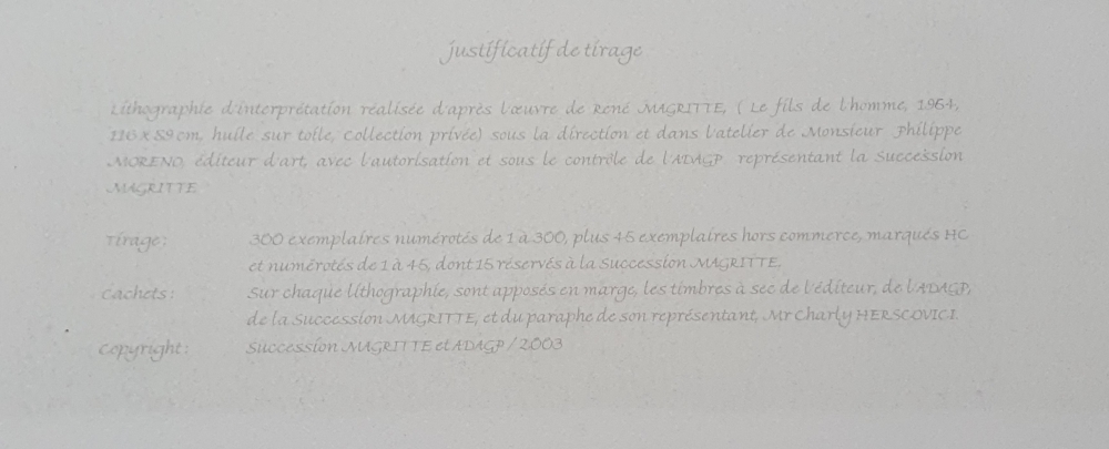 Very beautiful and colorful color lithograph (2003) after the original work of Magritte 'Le fils de l'homme' from 1964 released by the studio of Philippe Moreno with permission and under the control of the ADAGP which represents the legacy of René Magritte. Magritte's signature is printed. The work is paragraphed by Charly Herscovici, representative of the Magritte estate. The work is numbered 295/300 and also contains dry stamps from the publisher ADAGP and the Magritte estate. The work has never been framed and is in very good condition. The gallery price for this work is 2500 to 3000 euros.