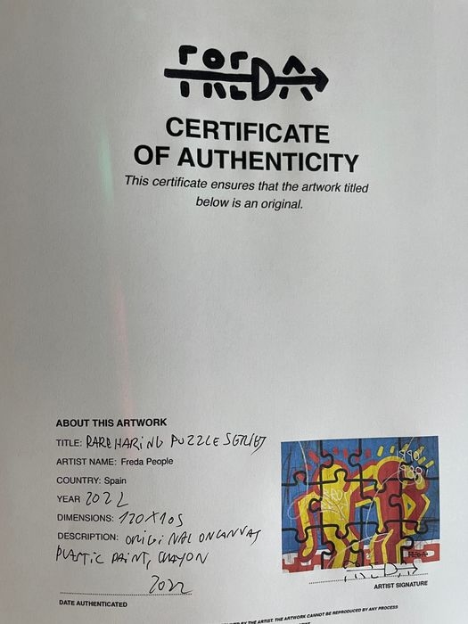 Ideal investment for companies and individuals. Big format painting Plastic paint on canvas Typical style of Freda People Size 105cm x 120cm The canvas comes with certificate of authenticity by "Freda People" Gallery price: 3000 View the artwork in our online gallery: https://assets.artplacer.com/virtual-exhibitions/?i=4952 Freda People Art are David Salvador and Javier Salvador, 2 young brothers from Barcelona, Spain. From their early years they felt great attraction for art in all its aspects, they began painting in the street, inspired by artists like Keith Haring, Basquiat, Picasso, or Dali. Many artists, including Joaquim Falco, are inspired by his art. His works are in galleries in the United States, France, Austria, Germany, Finland. They have collaborated on paintings with the actor and painter Jordi Mollà in Miami, 2020. In November 2021 they carry out a project in Milan with the celebrity of Tik Tok Khaby Lame. With an eclectic style they paint, make sculptures and collage, they have sold more than a thousand works around the world. They usually participate in exhibitions and galleries in Barcelona, where they currently work, although their works have been sold in places such as United States, Mexico, Spain, France, Belgium, Austria, Switzerland, Germany, Italy, Sweden, Poland, Finland, Uk, Hungary, Romania, Japan, Estonia, Turkey, Puerto Rico, Czech Republic, China.