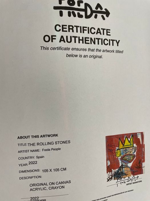 Ideal investment for companies and individuals. Big format painting Plastic paint on canvas Typical style of Freda People Size 110cm x 105cm The canvas comes with certificate of authenticity by "Freda People" Gallery price: 3000 Freda People Art are David Salvador and Javier Salvador, 2 young brothers from Barcelona, Spain. From their early years they felt great attraction for art in all its aspects, they began painting in the street, inspired by artists like Keith Haring, Basquiat, Picasso, or Dali. Many artists, including Joaquim Falco, are inspired by his art. His works are in galleries in the United States, France, Austria, Germany, Finland. They have collaborated on paintings with the actor and painter Jordi Mollà in Miami, 2020. In November 2021 they carry out a project in Milan with the celebrity of Tik Tok Khaby Lame. With an eclectic style they paint, make sculptures and collage, they have sold more than a thousand works around the world. They usually participate in exhibitions and galleries in Barcelona, where they currently work, although their works have been sold in places such as United States, Mexico, Spain, France, Belgium, Austria, Switzerland, Germany, Italy, Sweden, Poland, Finland, Uk, Hungary, Romania, Japan, Estonia, Turkey, Puerto Rico, Czech Republic, China.
