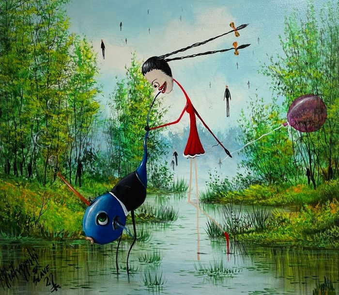 Ideal investment for companies and individuals. Oil paint on canvas Typical style of Jarosław Kiełczyński Size 50cm x 43cm The canvas comes with certificate of authenticity. Jarosław Kiełczyński was born in 1967. He graduated from High School of Art in Gdynia - Orłowo and Fine Arts University. He attended the workshop for Movie and Theater Art University in Łódź. His art is inspired by Bosch and Holland art masters. He designed theater set for Life is Beautiful. Currently he lives and paint in Kraków in Poland.
