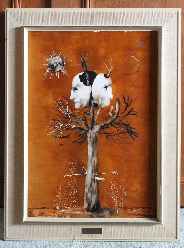The God Janus by the artist Lajos Sebok is an oil on panel with dimensions without a frame of 49 x 35 centimeters and with a frame of 61 x 46 centimeters. Inscriptions : signature lower right.