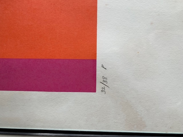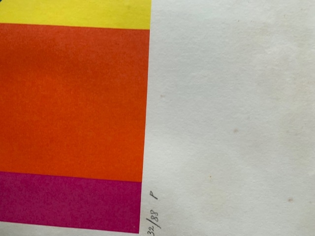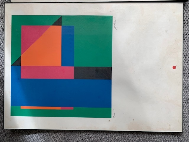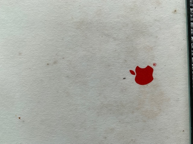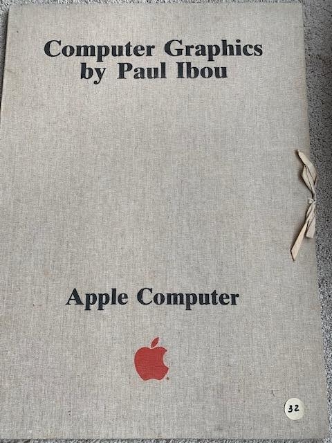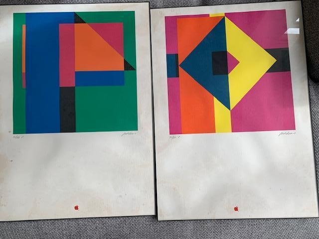 APPLE letters individually on color print drawn by Paul Ibou (logo designer internationally known). The 2 "P"s are framed and in less good condition (stains). The "L" and "E" are in perfect condition and not framed. The "A" is missing. The framed ones are also cropped 5cm. Ideal for Apple fan and/or collector.
