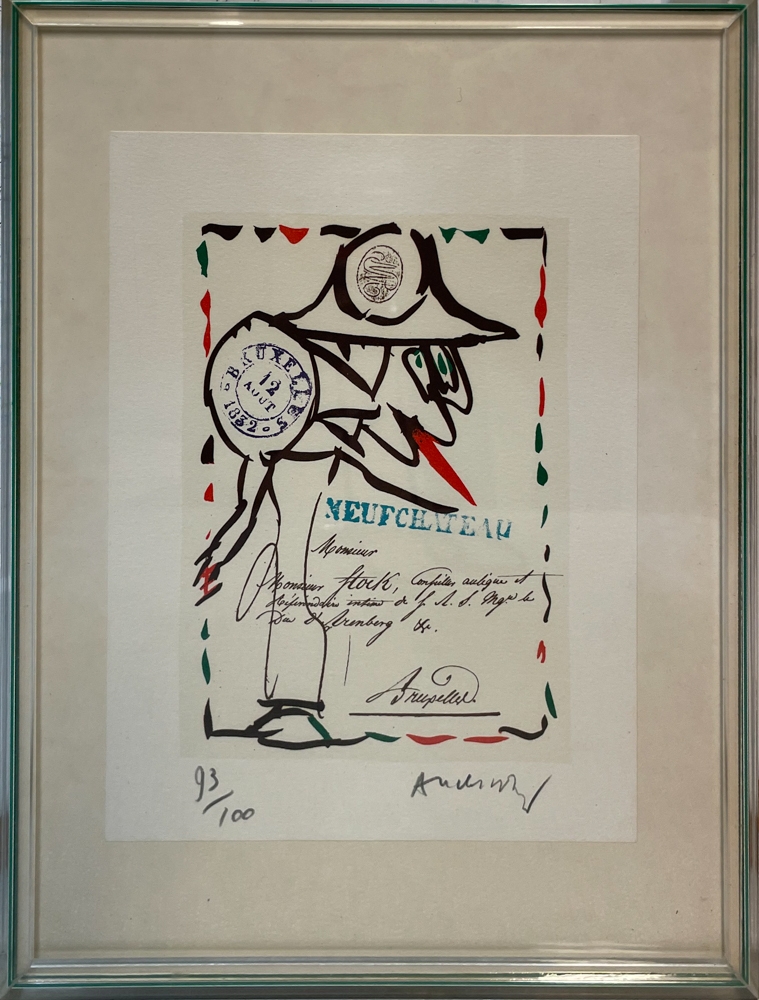 Lithograph by Pierre Alechinsky. Signed and numbered on 100 copies. The lithograph shows an old valuable document. The work is framed in a plexibox. The work and the plexibox are in perfect condition.