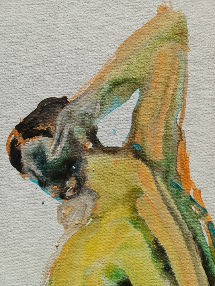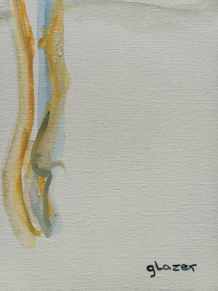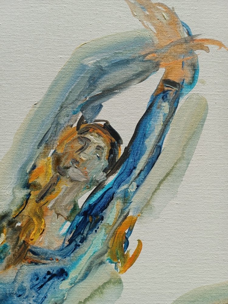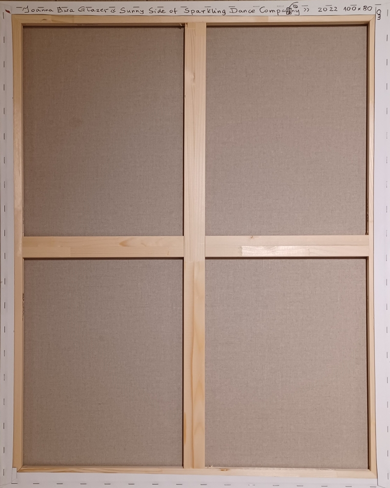 Large painting about 2 dancers. "My work is about emergence. In my art, I convey the sense of courage and difficulty of emergence of our own inner being. It is a universal desire, insofar as we show our talent, our true personality to the world. We are often double people, social and private. I see the beauty in the world. I am inspired by the immense pleasure and sense of discovery resulting from the continuous observation around me. I use photographic materials found in fashion magazines. The images of top models influence me especially with the pose, the gestures or the expressions of the face. In my current paintings, I also explore images of famous people, often artists. For me, these people have discovered courage. My paintings reflect the meaning of beauty, resilience and, despite the difficulties, peace. Joanna Glazer"